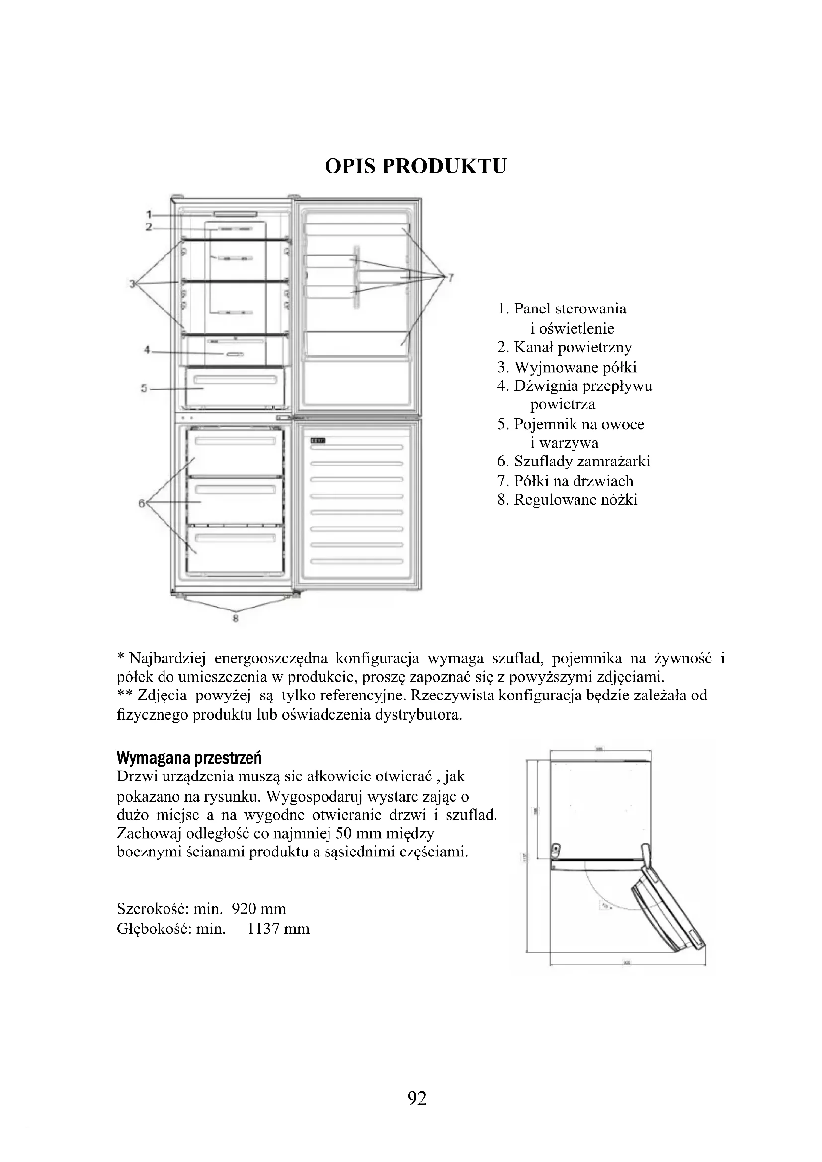 - Najbardziej energooszczędna konfiguracja wymaga szuflad, pojemnika na żywność i półek do umieszczenia w produkcie, proszę zapoznać się z powyższymi zdjęciami. ** Zdjęcia powyżej są tylko referencyjne. Rzeczywista konfiguracja będzie zależała od fizycznego produktu lub oświadczenia dystrybutora. Wymagana przestrzeń Drzwi urządzenia muszą sie ałkowicie otwierać , jak pokazano na rysunku. Wygospodaruj wystarc zając o dużo miejsc a na wygodne otwieranie drzwi i szuflad. Zachowaj odległość co najmniej 50 mm między bocznymi ścianami produktu a sąsiednimi częściami. Szerokość: min. 920 mm Głębokość: min. 1137 mm93 UŻYTKOWANIE Przycisk WŁ./WYŁ. służy do włączania/wyłączania urządzenia. Przycisk SET służy do regulacji temperatury lub do wyboru funkcji Super Cool. Ikona Super Cool pokazuje, czy funkcja jest aktywna.