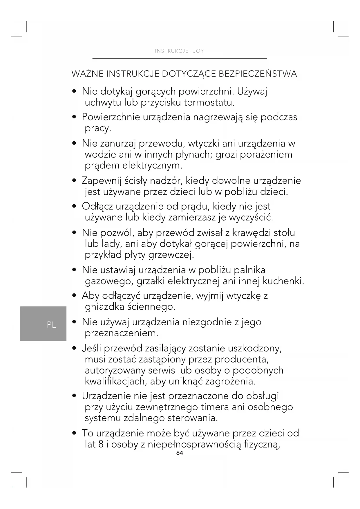 - Wartości parametrów elektrycznych dla tego urządzenia podano na tabliczce znamionowej.66 INSTRUKCJE · JOY