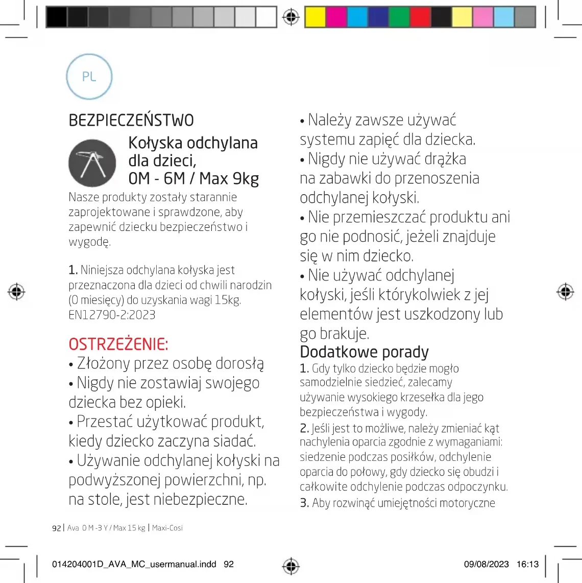 należy trzymać wszystkie torby foliowe i opakowania poza zasięgiem niemowląt i małych dzieci. Wysokie krzesełko dla dzieci, 6M - 36M / Max 15kg Nasze produkty zostały starannie zaprojektowane i sprawdzone, aby zapewnić dziecku bezpieczeństwo i wygodę. EN14988:2017+A1:2020. – Wysokie krzesełka dla dzieci. 014204001D_AVA_MC_usermanual.indd 93014204001D_AVA_MC_usermanual.indd 93 09/08/2023 16:1309/08/2023 16:1394 Ava 0 M -3 Y / Max 15 kg