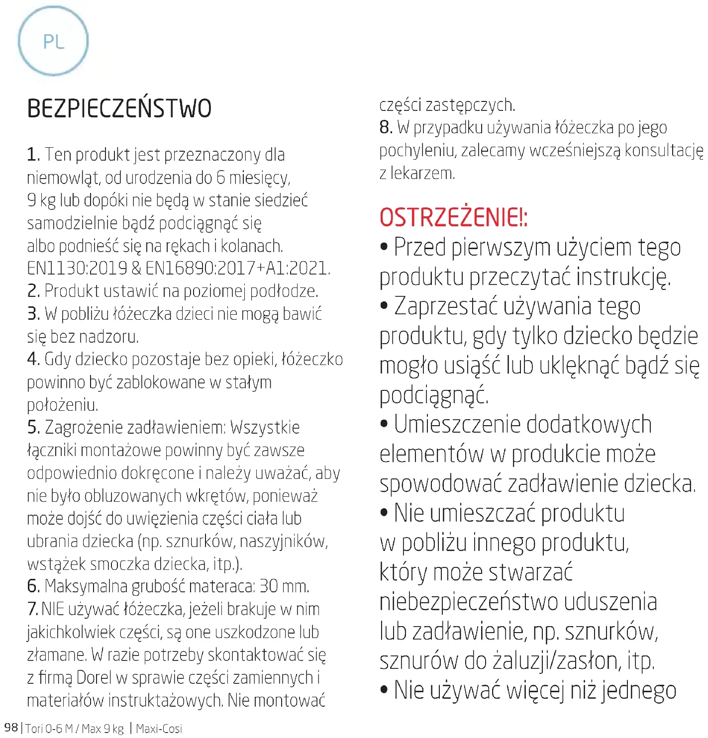 Maxi-Cosi Co zrobić w przypadku wykrycia wad: W razie pojawienia się problemów lub wad zalecamy kontakt z najbliższym autoryzowanym punktem serwisowym lub sprzedawcą marki upoważnionym przez naszą firmę, który jest zobowiązany do przestrzegania naszej 24-miesięcznej gwarancji (1) . Należy przedstawić dowód zakupu, którego dokonano w ciągu 24 miesięcy poprzedzających zgłoszenie serwisowe. Najlepiej jeżeli żądanie naprawy zostanie wstępnie zatwierdzone przez Dział serwisowy naszej firmy. W przypadku gdy zaistnieje konieczność wysłania produktu do punktu serwisowego, należy zwrócić produkt do autoryzowanego punktu serwisowego lub sprzedawcy lub do Działu serwisowego naszej firmy, uzgadniając sposób wysyłki i jego koszty z punktem serwisowym, ponieważ w przypadku braku takiego uzgodnienia gwarant może odmówić pokrycia kosztów przesyłki. Uszkodzenia i/lub wady, których nie obejmuje nasza gwarancja lub prawa konsumenta, i/lub uszkodzenia, i/lub wady produktu nieobjęte naszą gwarancją mogą być usunięte za uzasadnioną opłatą. Prawa konsumenta: Konsument ma prawo, zgodnie z odpowiednim ustawodawstwem, które może różnić się w zależności od kraju. Niniejsza gwarancja nie ma wpływu na prawa konsumenta podlegające odpowiedniemu ustawodawstwu krajowemu Niniejsza gwarancja została przygotowana przez Dorel Netherlands. Firma jest zarejestrowana w Holandii pod numerem 17060920. Adres firmy to: Korendijk 5, 5704 RD Helmond, The Netherlands. Adres pocztowy to: P.O. Box 6071, 5700 ET Helmond, The Netherlands. Nazwy i dane adresowe innych spółek zależnych grupy Dorel można znaleźć na ostatniej stronie instrukcji i na stronie internetowej marki. (1) Produkty zakupione od sprzedawcow detalicznych lub dealerów z usuniętymi albo zmienionymi etykietami lub numerami identyfikacyjnymi uważane są za nieautoryzowane. W związku z tym, że autentyczność takich produktow nie może być ustalona, gwarancja ich nie obejmuje. PLMaxi-Cosi