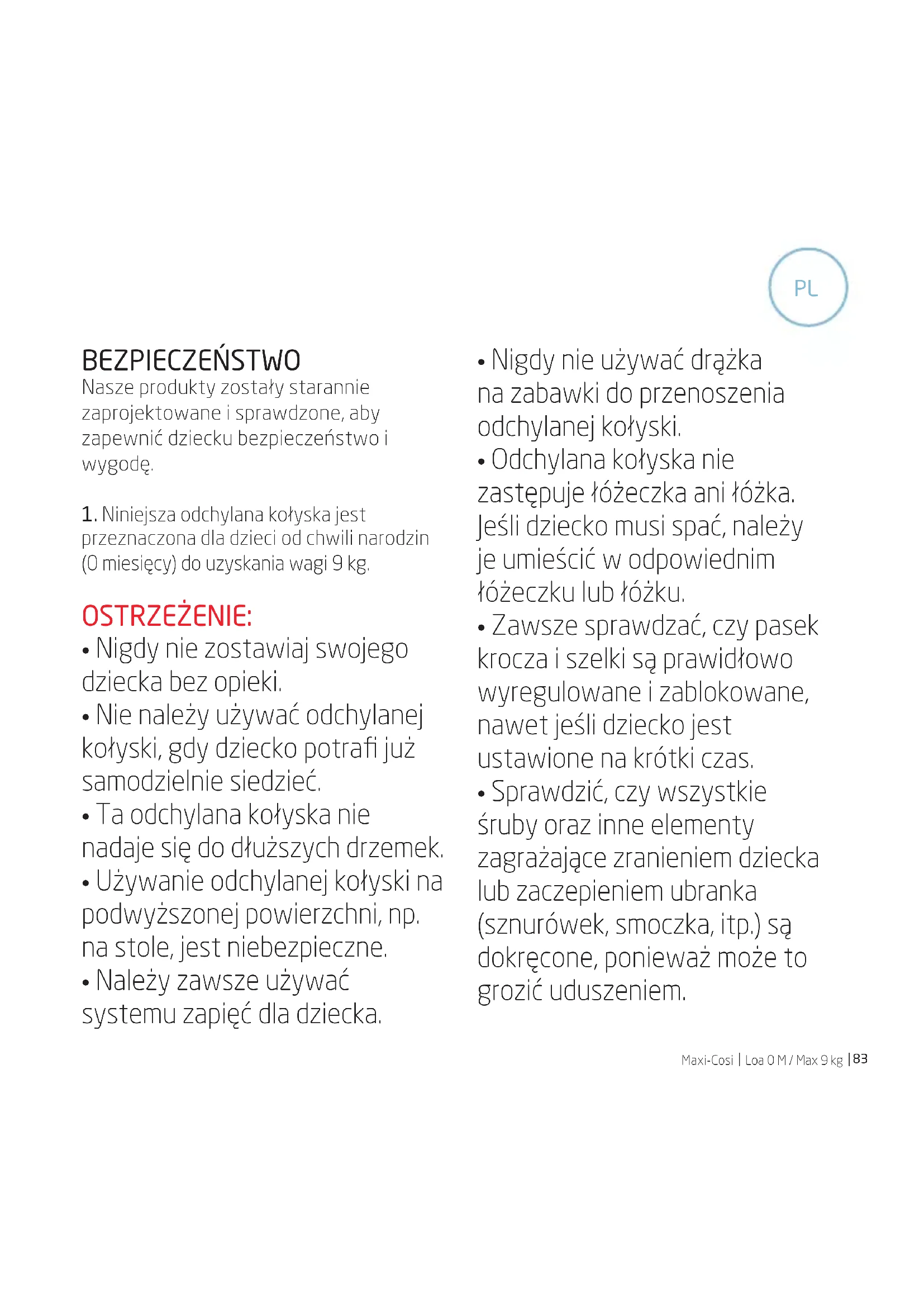 - Odchylana kołyska nie zastępuje łóżeczka ani łóżka. Jeśli dziecko musi spać, należy je umieścić w odpowiednim łóżeczku lub łóżku.