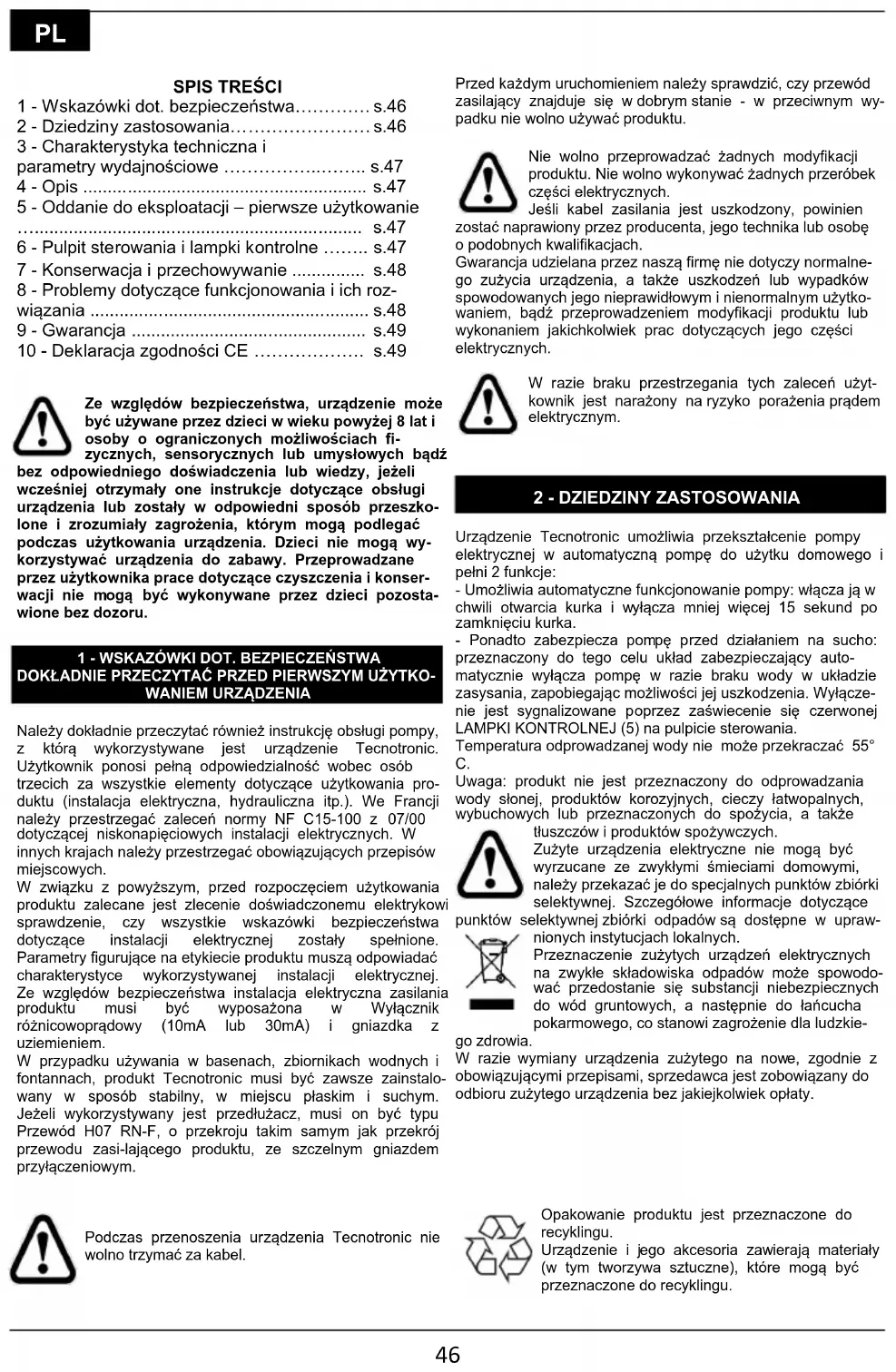 Należy dokładnie przeczytać również instrukcję obsługi pompy, z którą wykorzystywane jest urządzenie Tecnotronic. Użytkownik ponosi pełną odpowiedzialność wobec osób trzecich za wszystkie elementy dotyczące użytkowania pro- duktu (instalacja elektryczna, hydrauliczna itp.). We Francji należy przestrzegać zaleceń normy NF C15-100 z 07/00 dotyczącej niskonapięciowych instalacji elektrycznych. W innych krajach należy przestrzegać obowiązujących przepisów miejscowych. W związku z powyższym, przed rozpoczęciem użytkowania produktu zalecane jest zlecenie doświadczonemu elektrykowi sprawdzenie, czy wszystkie wskazówki bezpieczeństwa dotyczące instalacji elektrycznej zostały spełnione. Parametry figurujące na etykiecie produktu muszą odpowiadać charakterystyce wykorzystywanej instalacji elektrycznej. Ze względów bezpieczeństwa instalacja elektryczna zasilania produktu musi być wyposażona w Wyłącznik różnicowoprądowy (10mA lub 30mA) i gniazdka z uziemieniem. W przypadku używania w basenach, zbiornikach wodnych i fontannach, produkt Tecnotronic musi być zawsze zainstalo- wany w sposób stabilny, w miejscu płaskim i suchym. Jeżeli wykorzystywany jest przedłużacz, musi on być typu Przewód H07 RN-F, o przekroju takim samym jak przekrój przewodu zasi-lającego produktu, ze szczelnym gniazdem przyłączeniowym. Podczas przenoszenia urządzenia Tecnotronic nie wolno trzymać za kabel. Przed każdym uruchomieniem należy sprawdzić, czy przewód zasilający znajduje się w dobrym stanie - w przeciwnym wy- padku nie wolno używać produktu. Nie wolno przeprowadzać żadnych modyfikacji produktu. Nie wolno wykonywać żadnych przeróbek części elektrycznych. Jeśli kabel zasilania jest uszkodzony, powinien zostać naprawiony przez producenta, jego technika lub osobę o podobnych kwalifikacjach. Gwarancja udzielana przez naszą firmę nie dotyczy normalne- go zużycia urządzenia, a także uszkodzeń lub wypadków spowodowanych jego nieprawidłowym i nienormalnym użytko- waniem, bądź przeprowadzeniem modyfikacji produktu lub wykonaniem jakichkolwiek prac dotyczących jego części elektrycznych. W razie braku przestrzegania tych zaleceń użyt- kownik jest narażony na ryzyko porażenia prądem elektrycznym.