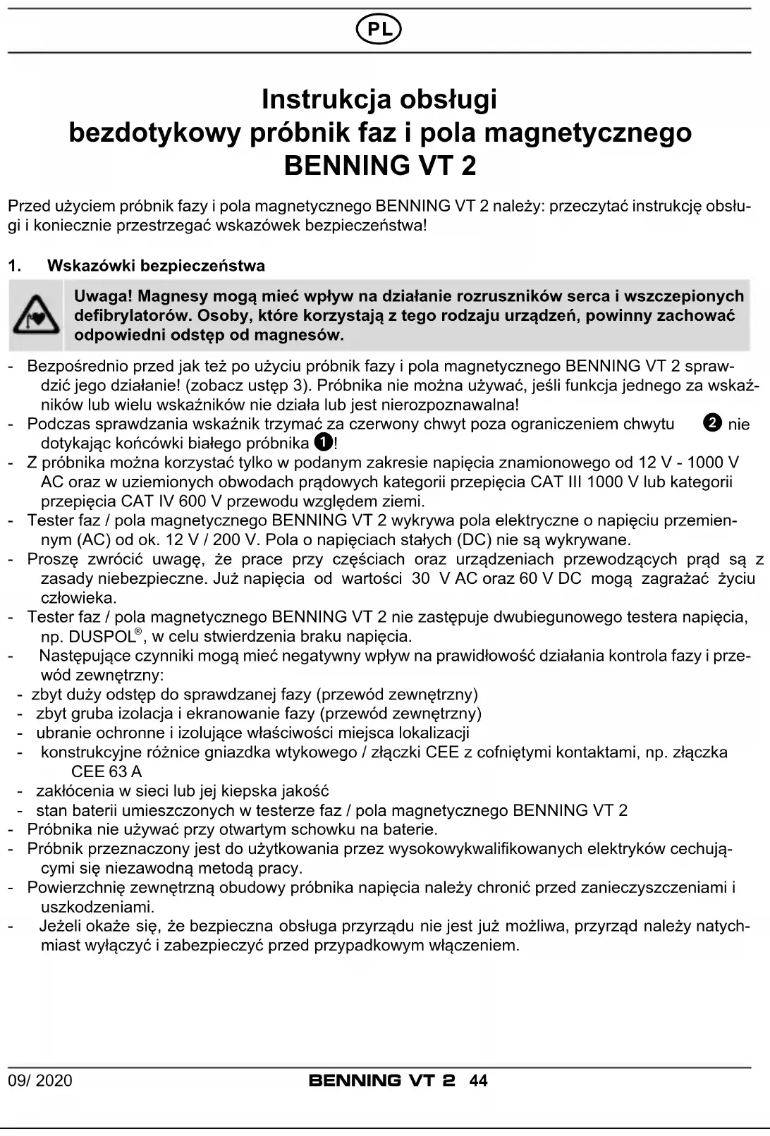 Instrukcjaobsługi bezdotykowypróbnikfazipolamagnetycznego BENNING VT 2 Przed użyciem próbnik fazy i pola magnetycznego BENNING VT 2 należy: przeczytać instrukcję obsłu- gi i koniecznie przestrzegać wskazówek bezpieczeństwa!