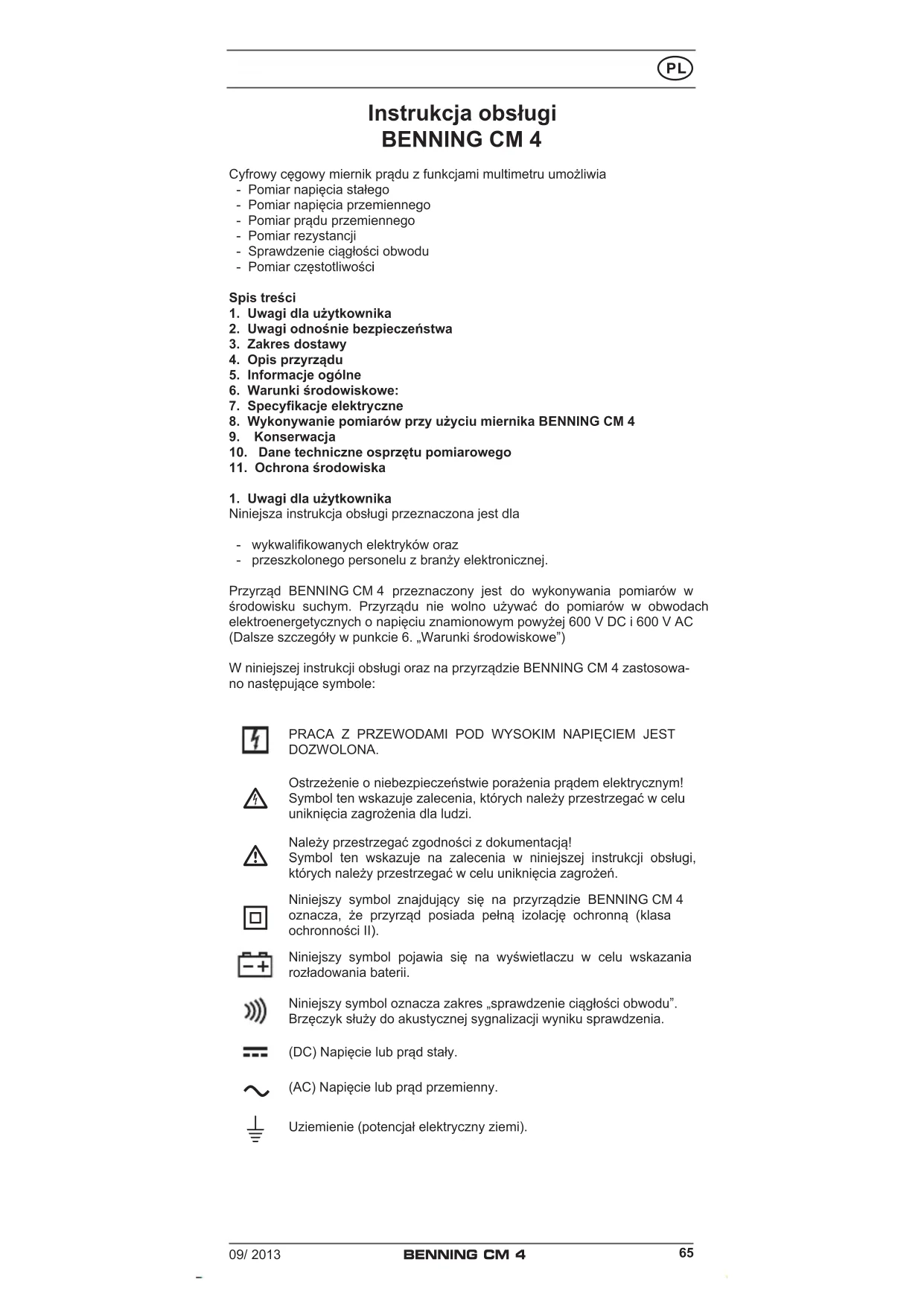 Uziemienie (potencjał elektryczny ziemi).09/ 2013 BENNING CM 4