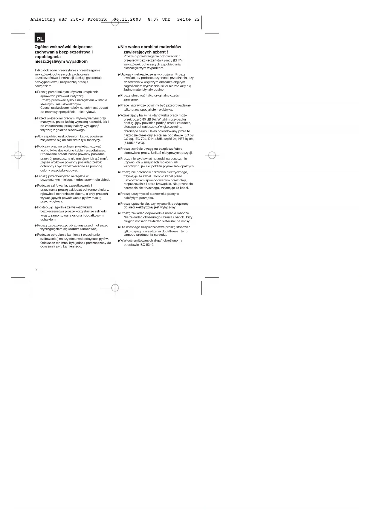 Spændeflange Flangemøtrik Placering af flangen ved brug af lige slibeskive Anleitung WSJ 230-3 Prowork 06.11.2003 8:07 Uhr Seite 2122 Ogólne wskazówki dotyczące zachowania bezpieczeństwa i zapobiegania nieszczęśliwym wypadkom Tylko dokładne przeczytanie i przestrzeganie wskazówek dotyczących zachowania bezpieczeństwa i instrukcji obsługi gwarantuje bezwypadkową i bezpieczną pracę z narzędziem. Proszę przed każdym użyciem urządzenia sprawdzić przewód i wtyczkę. Proszę pracować tylko z narzędziem w stanie idealnym i nieuszkodzonym. Części uszkodzone należy natychmiast oddać do naprawy specjaliście - elektrykowi. Przed wszystkimi pracami wykonywanymi przy maszynie, przed każdą wymianą narzędzi, jak i po zakończonej pracy należy wyciągnąć wtyczkę z gniazda sieciowego. Aby zapobiec uszkodzeniom kabla, powinien znajdować się on zawsze z tyłu maszyny. Podczas prac na wolnym powietrzu używać wolno tylko dozwolone kable - przedłużacze. Stosowane przedłużacze powinny posiadać przekrój poprzeczny nie mniejszy jak ą,5 mm