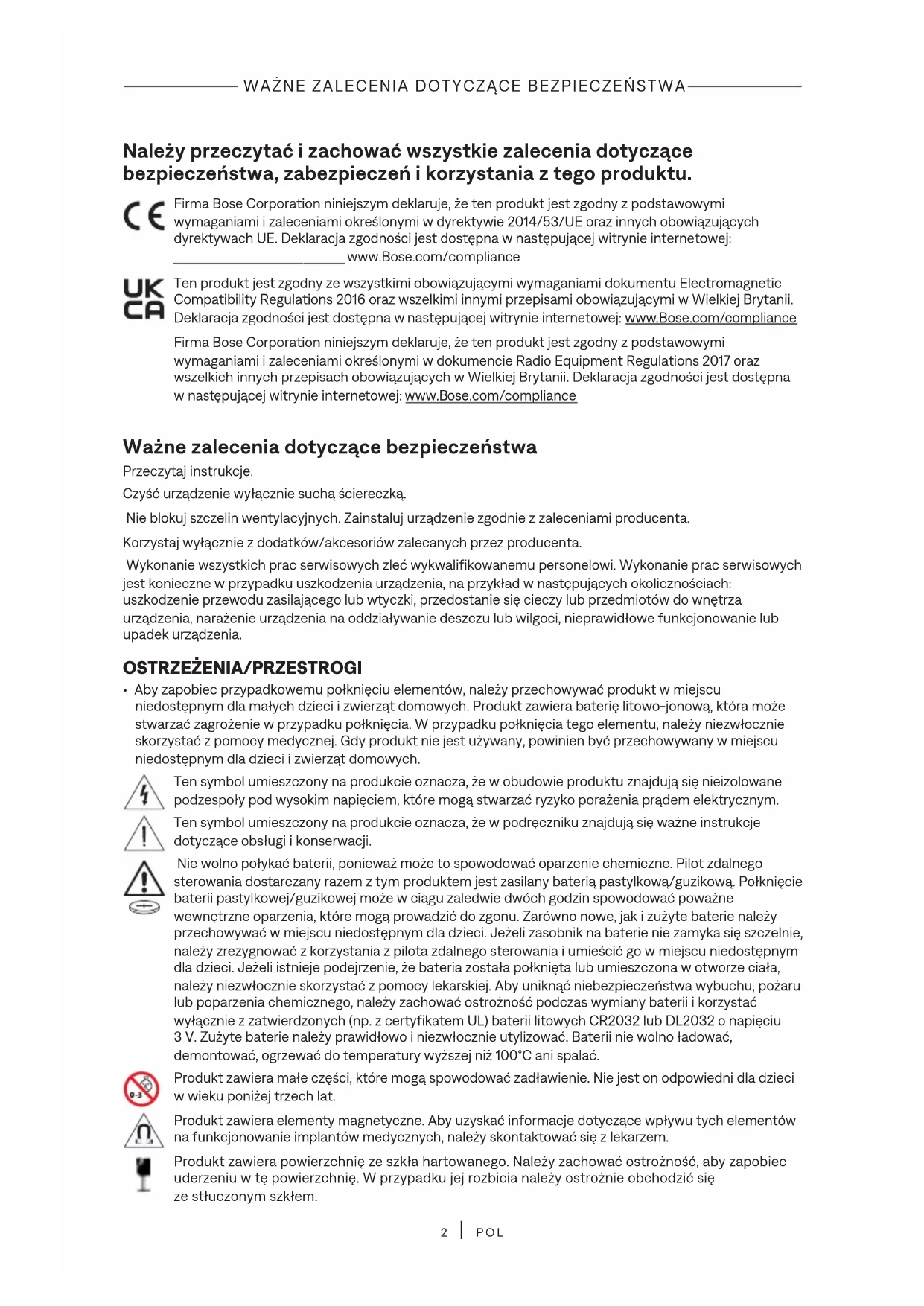 POL Należy przeczytać i zachować wszystkie zalecenia dotyczące bezpieczeństwa, zabezpieczeń i korzystania z tego produktu. Firma Bose Corporation niniejszym deklaruje, że ten produkt jest zgodny z podstawowymi wymaganiami i zaleceniami określonymi w dyrektywie 2014/53/UE oraz innych obowiązujących dyrektywach UE. Deklaracja zgodności jest dostępna w następującej witrynie internetowej: www.Bose.com/compliancewww.Bose.com/compliance Ten produkt jest zgodny ze wszystkimi obowiązującymi wymaganiami dokumentu Electromagnetic Compatibility Regulations 2016 oraz wszelkimi innymi przepisami obowiązującymi w Wielkiej Brytanii. Deklaracja zgodności jest dostępna w następującej witrynie internetowej: www.Bose.com/compliancewww.Bose.com/compliance Firma Bose Corporation niniejszym deklaruje, że ten produkt jest zgodny z podstawowymi wymaganiami i zaleceniami określonymi w dokumencie Radio Equipment Regulations 2017 oraz wszelkich innych przepisach obowiązujących w Wielkiej Brytanii. Deklaracja zgodności jest dostępna w następującej witrynie internetowej: www.Bose.com/compliancewww.Bose.com/compliance Ważne zalecenia dotyczące bezpieczeństwa Przeczytaj instrukcje. Czyść urządzenie wyłącznie suchą ściereczką. Nie blokuj szczelin wentylacyjnych. Zainstaluj urządzenie zgodnie z zaleceniami producenta. Korzystaj wyłącznie z dodatków/akcesoriów zalecanych przez producenta. Wykonanie wszystkich prac serwisowych zleć wykwalifikowanemu personelowi. Wykonanie prac serwisowych jest konieczne w przypadku uszkodzenia urządzenia, na przykład w następujących okolicznościach: uszkodzenie przewodu zasilającego lub wtyczki, przedostanie się cieczy lub przedmiotów do wnętrza urządzenia, narażenie urządzenia na oddziaływanie deszczu lub wilgoci, nieprawidłowe funkcjonowanie lub upadek urządzenia.