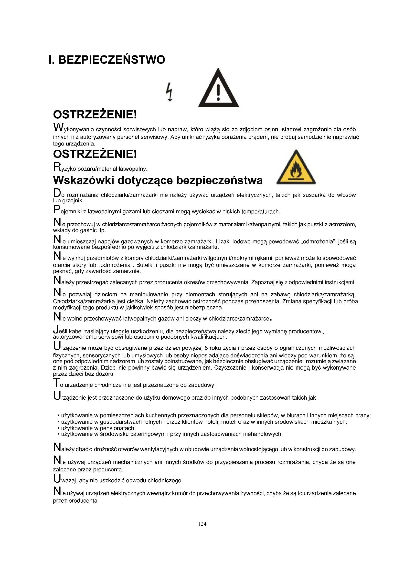 OSTRZEŻENIE! Wykonywanie czynności serwisowych lub napraw, które wiążą się ze zdjęciem osłon, stanowi zagrożenie dla osób innych niż autoryzowany personel serwisowy. Aby uniknąć ryzyka porażenia prądem, nie próbuj samodzielnie naprawiać tego urządzenia. OSTRZEŻENIE! Ryzyko pożaru/materiał łatwopalny. Wskazówki dotyczące bezpieczeństwa Do rozmrażania chłodziarki/zamrażarki nie należy używać urządzeń elektrycznych, takich jak suszarka do włosów lub grzejnik. Pojemniki z łatwopalnymi gazami lub cieczami mogą wyciekać w niskich temperaturach. Nie przechowuj w chłodziarce/zamrażarce żadnych pojemników z materiałami łatwopalnymi, takich jak puszki z aerozolem, wkłady do gaśnic itp. Nie umieszczaj napojów gazowanych w komorze zamrażarki. Lizaki lodowe mogą powodować „odmrożenia”, jeśli są konsumowane bezpośrednio po wyjęciu z chłodziarki/zamrażarki. Nie wyjmuj przedmiotów z komory chłodziarki/zamrażarki wilgotnymi/mokrymi rękami, ponieważ może to spowodować otarcia skóry lub „odmrożenia”. Butelki i puszki nie mogą być umieszczane w komorze zamrażarki, ponieważ mogą pęknąć, gdy zawartość zamarznie. Należy przestrzegać zalecanych przez producenta okresów przechowywania. Zapoznaj się z odpowiednimi instrukcjami. Nie pozwalaj dzieciom na manipulowanie przy elementach sterujących ani na zabawę chłodziarką/zamrażarką. Chłodziarka/zamrażarka jest ciężka. Należy zachować ostrożność podczas przenoszenia. Zmiana specyfikacji lub próba modyfikacji tego produktu w jakikolwiek sposób jest niebezpieczna. Nie wolno przechowywać łatwopalnych gazów ani cieczy w chłodziarce/zamrażarce. Jeśli kabel zasilający ulegnie uszkodzeniu, dla bezpieczeństwa należy zlecić jego wymianę producentowi, autoryzowanemu serwisowi lub osobom o podobnych kwalifikacjach. Urządzenie może być obsługiwane przez dzieci powyżej 8 roku życia i przez osoby o ograniczonych możliwościach fizycznych, sensorycznych lub umysłowych lub osoby nieposiadające doświadczenia ani wiedzy pod warunkiem, że są one pod odpowiednim nadzorem lub zostały poinstruowane, jak bezpiecznie obsługiwać urządzenie i rozumieją związane z nim zagrożenia. Dzieci nie powinny bawić się urządzeniem. Czyszczenie i konserwacja nie mogą być wykonywane przez dzieci bez dozoru. To urządzenie chłodnicze nie jest przeznaczone do zabudowy. Urządzenie jest przeznaczone do użytku domowego oraz do innych podobnych zastosowań takich jak