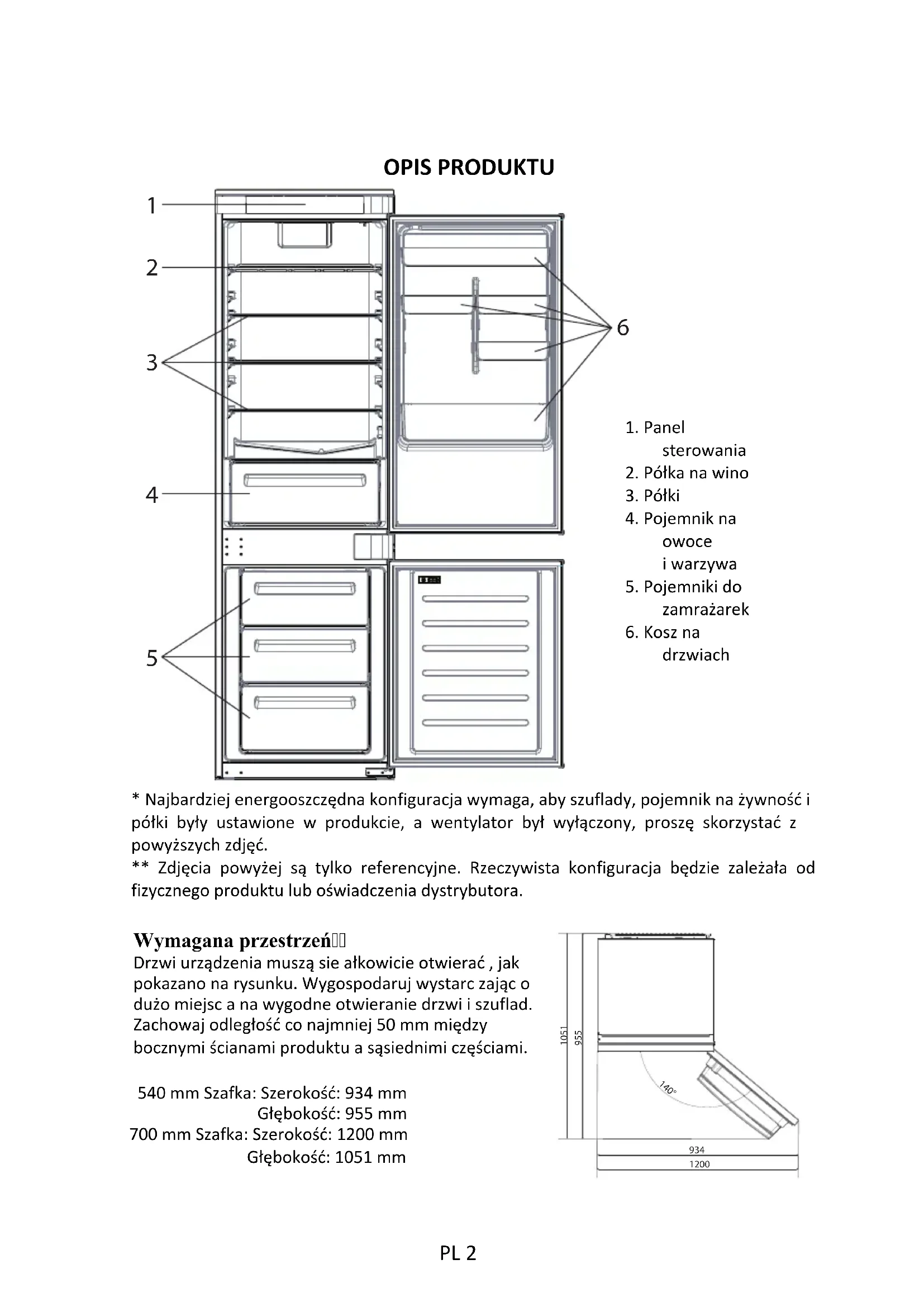 - Najbardziej energooszczędna konfiguracja wymaga, aby szuflady, pojemnik na żywność i półki były ustawione w produkcie, a wentylator był wyłączony, proszę skorzystać z powyższych zdjęć. ** Zdjęcia powyżej są tylko referencyjne. Rzeczywista konfiguracja będzie zależała od fizycznego produktu lub oświadczenia dystrybutora. Wymagana przestrzeń Drzwi urządzenia muszą sie ałkowicie otwierać , jak pokazano na rysunku. Wygospodaruj wystarc zając o dużo miejsc a na wygodne otwieranie drzwi i szuflad. Zachowaj odległość co najmniej 50 mm między bocznymi ścianami produktu a sąsiednimi częściami. 540 mm Szafka: Szerokość: 934 mm Głębokość: 955 mm 700 mm Szafka: Szerokość: 1200 mm Głębokość: 1051 mm