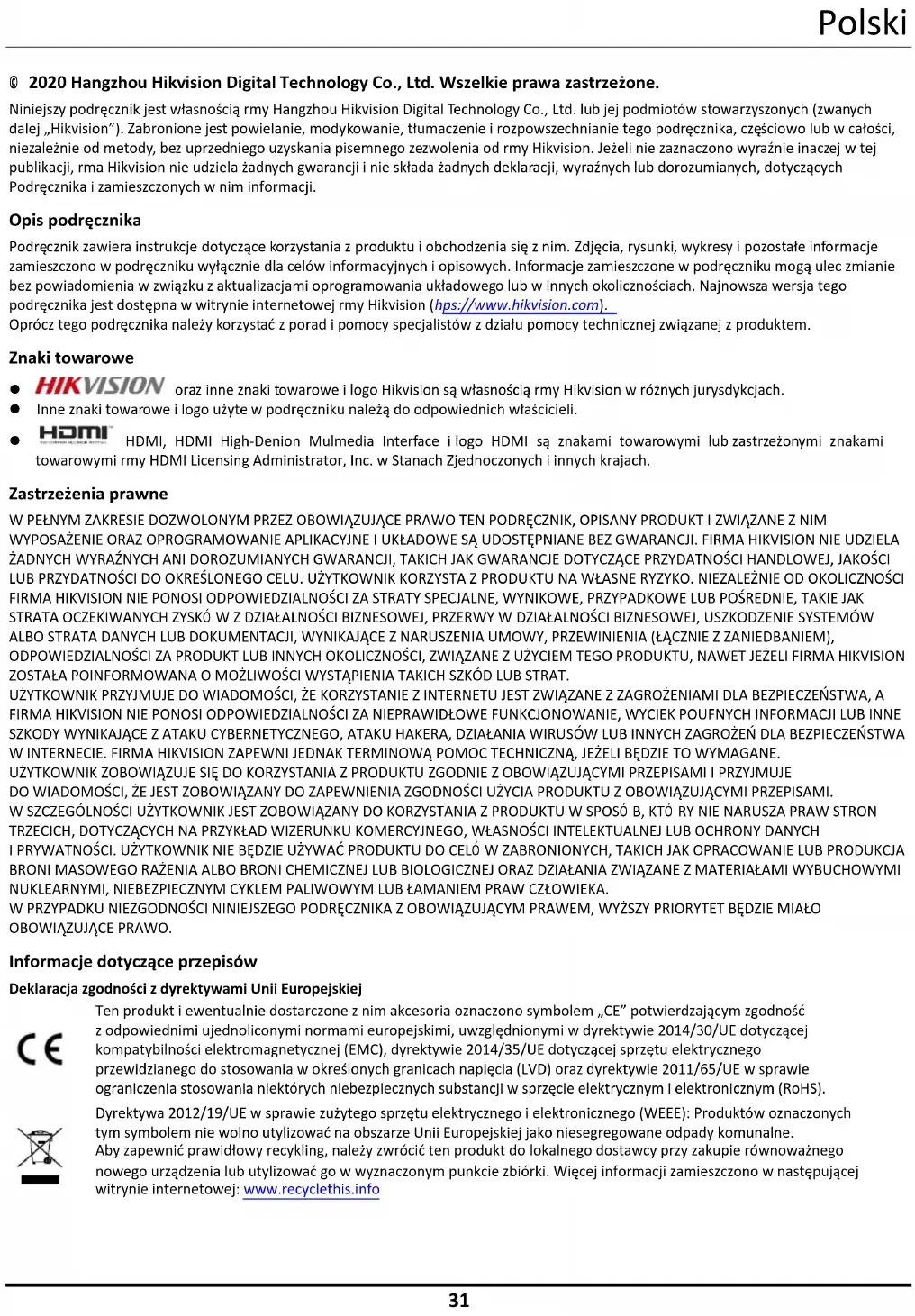 © 2020 Hangzhou Hikvision Digital Technology Co., Ltd. Wszelkie prawa zastrzeżone. Niniejszy podręcznik jest własnością firmy Hangzhou Hikvision Digital Technology Co., Ltd. lub jej podmiotów stowarzyszonych (zwanych dalej „Hikvision”). Zabronione jest powielanie, modyfikowanie, tłumaczenie i rozpowszechnianie tego podręcznika, częściowo lub w całości, niezależnie od metody, bez uprzedniego uzyskania pisemnego zezwolenia od firmy Hikvision. Jeżeli nie zaznaczono wyraźnie inaczej w tej publikacji, firma Hikvision nie udziela żadnych gwarancji i nie składa żadnych deklaracji, wyraźnych lub dorozumianych, dotyczących Podręcznika i zamieszczonych w nim informacji. Opis podręcznika Podręcznik zawiera instrukcje dotyczące korzystania z produktu i obchodzenia się z nim. Zdjęcia, rysunki, wykresy i pozostałe informacje zamieszczono w podręczniku wyłącznie dla celów informacyjnych i opisowych. Informacje zamieszczone w podręczniku mogą ulec zmianie bez powiadomienia w związku z aktualizacjami oprogramowania układowego lub w innych okolicznościach. Najnowsza wersja tego podręcznika jest dostępna w witrynie internetowej firmy Hikvision (https://www.hikvision.com). Oprócz tego podręcznika należy korzystać z porad i pomocy specjalistów z działu pomocy technicznej związanej z produktem. Znaki towarowe oraz inne znaki towarowe i logo Hikvision są własnością firmy Hikvision w różnych jurysdykcjach. Inne znaki towarowe i logo użyte w podręczniku należą do odpowiednich właścicieli. HDMI, HDMI High-Definition Multimedia Interface i logo HDMI są znakami towarowymi lub zastrzeżonymi znakami towarowymi firmy HDMI Licensing Administrator, Inc. w Stanach Zjednoczonych i innych krajach. Zastrzeżenia prawne W PEŁNYM ZAKRESIE DOZWOLONYM PRZEZ OBOWIĄZUJĄCE PRAWO TEN PODRĘCZNIK, OPISANY PRODUKT I ZWIĄZANE Z NIM WYPOSAŻENIE ORAZ OPROGRAMOWANIE APLIKACYJNE I UKŁADOWE SĄ UDOSTĘPNIANE BEZ GWARANCJI. FIRMA HIKVISION NIE UDZIELA ŻADNYCH WYRAŹNYCH ANI DOROZUMIANYCH GWARANCJI, TAKICH JAK GWARANCJE DOTYCZĄCE PRZYDATNOŚCI HANDLOWEJ, JAKOŚCI LUB PRZYDATNOŚCI DO OKREŚLONEGO CELU. UŻYTKOWNIK KORZYSTA Z PRODUKTU NA WŁASNE RYZYKO. NIEZALEŻNIE OD OKOLICZNOŚCI FIRMA HIKVISION NIE PONOSI ODPOWIEDZIALNOŚCI ZA STRATY SPECJALNE, WYNIKOWE, PRZYPADKOWE LUB POŚREDNIE, TAKIE JAK STRATA OCZEKIWANYCH ZYSKÓ W Z DZIAŁALNOŚCI BIZNESOWEJ, PRZERWY W DZIAŁALNOŚCI BIZNESOWEJ, USZKODZENIE SYSTEMÓW ALBO STRATA DANYCH LUB DOKUMENTACJI, WYNIKAJĄCE Z NARUSZENIA UMOWY, PRZEWINIENIA (ŁĄCZNIE Z ZANIEDBANIEM), ODPOWIEDZIALNOŚCI ZA PRODUKT LUB INNYCH OKOLICZNOŚCI, ZWIĄZANE Z UŻYCIEM TEGO PRODUKTU, NAWET JEŻELI FIRMA HIKVISION ZOSTAŁA POINFORMOWANA O MOŻLIWOŚCI WYSTĄPIENIA TAKICH SZKÓD LUB STRAT. UŻYTKOWNIK PRZYJMUJE DO WIADOMOŚCI, ŻE KORZYSTANIE Z INTERNETU JEST ZWIĄZANE Z ZAGROŻENIAMI DLA BEZPIECZEŃSTWA, A FIRMA HIKVISION NIE PONOSI ODPOWIEDZIALNOŚCI ZA NIEPRAWIDŁOWE FUNKCJONOWANIE, WYCIEK POUFNYCH INFORMACJI LUB INNE SZKODY WYNIKAJĄCE Z ATAKU CYBERNETYCZNEGO, ATAKU HAKERA, DZIAŁANIA WIRUSÓW LUB INNYCH ZAGROŻEŃ DLA BEZPIECZEŃSTWA W INTERNECIE. FIRMA HIKVISION ZAPEWNI JEDNAK TERMINOWĄ POMOC TECHNICZNĄ, JEŻELI BĘDZIE TO WYMAGANE. UŻYTKOWNIK ZOBOWIĄZUJE SIĘ DO KORZYSTANIA Z PRODUKTU ZGODNIE Z OBOWIĄZUJĄCYMI PRZEPISAMI I PRZYJMUJE DO WIADOMOŚCI, ŻE JEST ZOBOWIĄZANY DO ZAPEWNIENIA ZGODNOŚCI UŻYCIA PRODUKTU Z OBOWIĄZUJĄCYMI PRZEPISAMI. W SZCZEGÓLNOŚCI UŻYTKOWNIK JEST ZOBOWIĄZANY DO KORZYSTANIA Z PRODUKTU W SPOSÓ B, KTÓ RY NIE NARUSZA PRAW STRON TRZECICH, DOTYCZĄCYCH NA PRZYKŁAD WIZERUNKU KOMERCYJNEGO, WŁASNOŚCI INTELEKTUALNEJ LUB OCHRONY DANYCH I PRYWATNOŚCI. UŻYTKOWNIK NIE BĘDZIE UŻYWAĆ PRODUKTU DO CELÓ W ZABRONIONYCH, TAKICH JAK OPRACOWANIE LUB PRODUKCJA BRONI MASOWEGO RAŻENIA ALBO BRONI CHEMICZNEJ LUB BIOLOGICZNEJ ORAZ DZIAŁANIA ZWIĄZANE Z MATERIAŁAMI WYBUCHOWYMI NUKLEARNYMI, NIEBEZPIECZNYM CYKLEM PALIWOWYM LUB ŁAMANIEM PRAW CZŁOWIEKA. W PRZYPADKU NIEZGODNOŚCI NINIEJSZEGO PODRĘCZNIKA Z OBOWIĄZUJĄCYM PRAWEM, WYŻSZY PRIORYTET BĘDZIE MIAŁO OBOWIĄZUJĄCE PRAWO. Informacje dotyczące przepisów Deklaracja zgodności z dyrektywami Unii Europejskiej
