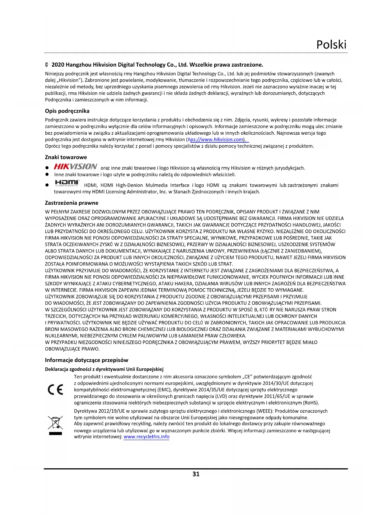 © 2020 Hangzhou Hikvision Digital Technology Co., Ltd. Wszelkie prawa zastrzeżone. Niniejszy podręcznik jest własnością firmy Hangzhou Hikvision Digital Technology Co., Ltd. lub jej podmiotów stowarzyszonych (zwanych dalej „Hikvision”). Zabronione jest powielanie, modyfikowanie, tłumaczenie i rozpowszechnianie tego podręcznika, częściowo lub w całości, niezależnie od metody, bez uprzedniego uzyskania pisemnego zezwolenia od firmy Hikvision. Jeżeli nie zaznaczono wyraźnie inaczej w tej publikacji, firma Hikvision nie udziela żadnych gwarancji i nie składa żadnych deklaracji, wyraźnych lub dorozumianych, dotyczących Podręcznika i zamieszczonych w nim informacji. Opis podręcznika Podręcznik zawiera instrukcje dotyczące korzystania z produktu i obchodzenia się z nim. Zdjęcia, rysunki, wykresy i pozostałe informacje zamieszczono w podręczniku wyłącznie dla celów informacyjnych i opisowych. Informacje zamieszczone w podręczniku mogą ulec zmianie bez powiadomienia w związku z aktualizacjami oprogramowania układowego lub w innych okolicznościach. Najnowsza wersja tego podręcznika jest dostępna w witrynie internetowej firmy Hikvision (https://www.hikvision.com). Oprócz tego podręcznika należy korzystać z porad i pomocy specjalistów z działu pomocy technicznej związanej z produktem. Znaki towarowe oraz inne znaki towarowe i logo Hikvision są własnością firmy Hikvision w różnych jurysdykcjach. Inne znaki towarowe i logo użyte w podręczniku należą do odpowiednich właścicieli. HDMI, HDMI High-Definition Multimedia Interface i logo HDMI są znakami towarowymi lub zastrzeżonymi znakami towarowymi firmy HDMI Licensing Administrator, Inc. w Stanach Zjednoczonych i innych krajach. Zastrzeżenia prawne W PEŁNYM ZAKRESIE DOZWOLONYM PRZEZ OBOWIĄZUJĄCE PRAWO TEN PODRĘCZNIK, OPISANY PRODUKT I ZWIĄZANE Z NIM WYPOSAŻENIE ORAZ OPROGRAMOWANIE APLIKACYJNE I UKŁADOWE SĄ UDOSTĘPNIANE BEZ GWARANCJI. FIRMA HIKVISION NIE UDZIELA ŻADNYCH WYRAŹNYCH ANI DOROZUMIANYCH GWARANCJI, TAKICH JAK GWARANCJE DOTYCZĄCE PRZYDATNOŚCI HANDLOWEJ, JAKOŚCI LUB PRZYDATNOŚCI DO OKREŚLONEGO CELU. UŻYTKOWNIK KORZYSTA Z PRODUKTU NA WŁASNE RYZYKO. NIEZALEŻNIE OD OKOLICZNOŚCI FIRMA HIKVISION NIE PONOSI ODPOWIEDZIALNOŚCI ZA STRATY SPECJALNE, WYNIKOWE, PRZYPADKOWE LUB POŚREDNIE, TAKIE JAK STRATA OCZEKIWANYCH ZYSKÓ W Z DZIAŁALNOŚCI BIZNESOWEJ, PRZERWY W DZIAŁALNOŚCI BIZNESOWEJ, USZKODZENIE SYSTEMÓW ALBO STRATA DANYCH LUB DOKUMENTACJI, WYNIKAJĄCE Z NARUSZENIA UMOWY, PRZEWINIENIA (ŁĄCZNIE Z ZANIEDBANIEM), ODPOWIEDZIALNOŚCI ZA PRODUKT LUB INNYCH OKOLICZNOŚCI, ZWIĄZANE Z UŻYCIEM TEGO PRODUKTU, NAWET JEŻELI FIRMA HIKVISION ZOSTAŁA POINFORMOWANA O MOŻLIWOŚCI WYSTĄPIENIA TAKICH SZKÓD LUB STRAT. UŻYTKOWNIK PRZYJMUJE DO WIADOMOŚCI, ŻE KORZYSTANIE Z INTERNETU JEST ZWIĄZANE Z ZAGROŻENIAMI DLA BEZPIECZEŃSTWA, A FIRMA HIKVISION NIE PONOSI ODPOWIEDZIALNOŚCI ZA NIEPRAWIDŁOWE FUNKCJONOWANIE, WYCIEK POUFNYCH INFORMACJI LUB INNE SZKODY WYNIKAJĄCE Z ATAKU CYBERNETYCZNEGO, ATAKU HAKERA, DZIAŁANIA WIRUSÓW LUB INNYCH ZAGROŻEŃ DLA BEZPIECZEŃSTWA W INTERNECIE. FIRMA HIKVISION ZAPEWNI JEDNAK TERMINOWĄ POMOC TECHNICZNĄ, JEŻELI BĘDZIE TO WYMAGANE. UŻYTKOWNIK ZOBOWIĄZUJE SIĘ DO KORZYSTANIA Z PRODUKTU ZGODNIE Z OBOWIĄZUJĄCYMI PRZEPISAMI I PRZYJMUJE DO WIADOMOŚCI, ŻE JEST ZOBOWIĄZANY DO ZAPEWNIENIA ZGODNOŚCI UŻYCIA PRODUKTU Z OBOWIĄZUJĄCYMI PRZEPISAMI. W SZCZEGÓLNOŚCI UŻYTKOWNIK JEST ZOBOWIĄZANY DO KORZYSTANIA Z PRODUKTU W SPOSÓ B, KTÓ RY NIE NARUSZA PRAW STRON TRZECICH, DOTYCZĄCYCH NA PRZYKŁAD WIZERUNKU KOMERCYJNEGO, WŁASNOŚCI INTELEKTUALNEJ LUB OCHRONY DANYCH I PRYWATNOŚCI. UŻYTKOWNIK NIE BĘDZIE UŻYWAĆ PRODUKTU DO CELÓ W ZABRONIONYCH, TAKICH JAK OPRACOWANIE LUB PRODUKCJA BRONI MASOWEGO RAŻENIA ALBO BRONI CHEMICZNEJ LUB BIOLOGICZNEJ ORAZ DZIAŁANIA ZWIĄZANE Z MATERIAŁAMI WYBUCHOWYMI NUKLEARNYMI, NIEBEZPIECZNYM CYKLEM PALIWOWYM LUB ŁAMANIEM PRAW CZŁOWIEKA. W PRZYPADKU NIEZGODNOŚCI NINIEJSZEGO PODRĘCZNIKA Z OBOWIĄZUJĄCYM PRAWEM, WYŻSZY PRIORYTET BĘDZIE MIAŁO OBOWIĄZUJĄCE PRAWO. Informacje dotyczące przepisów Deklaracja zgodności z dyrektywami Unii Europejskiej