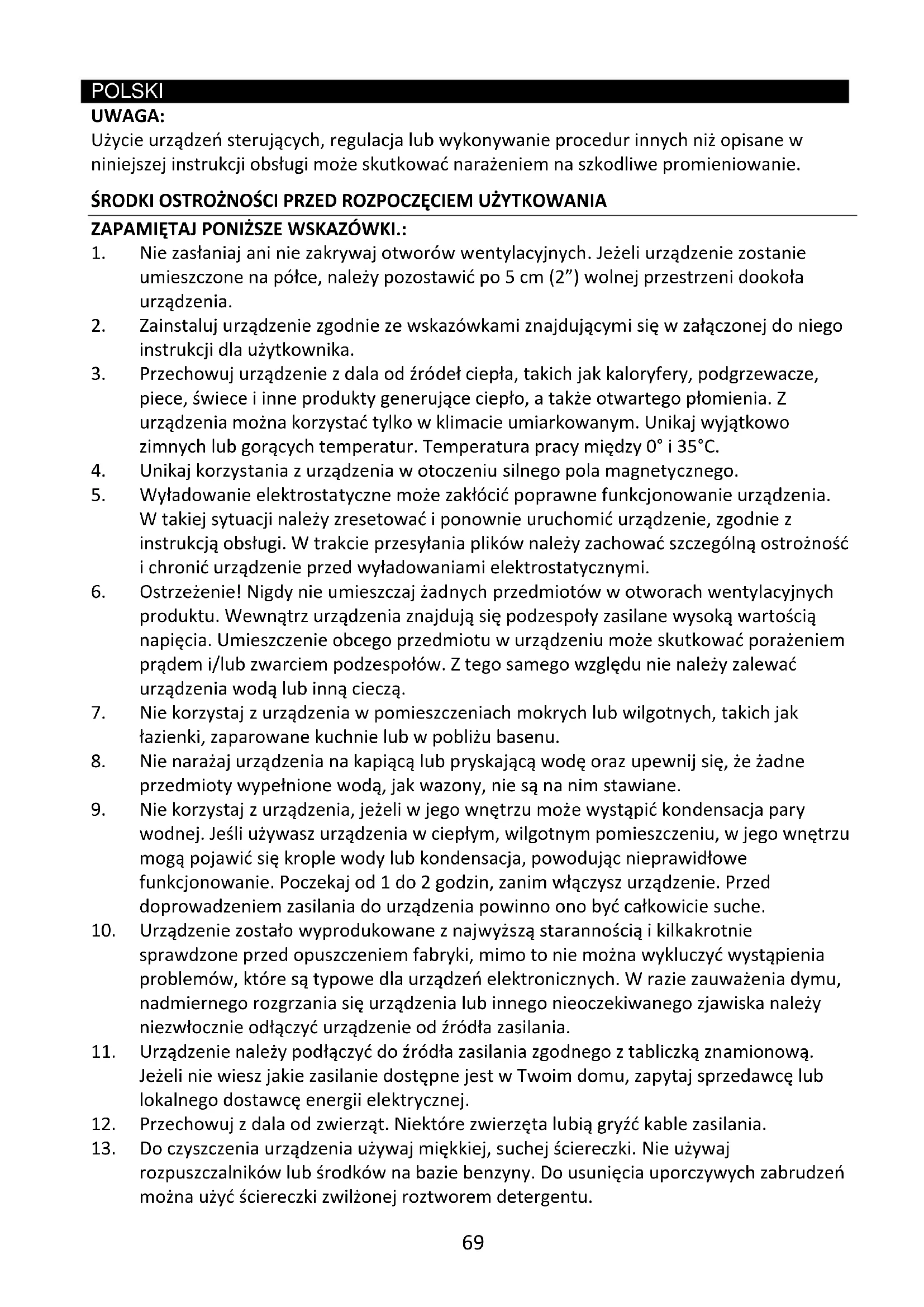 9. Nie korzystaj z urządzenia, jeżeli w jego wnętrzu może wystąpić kondensacja pary