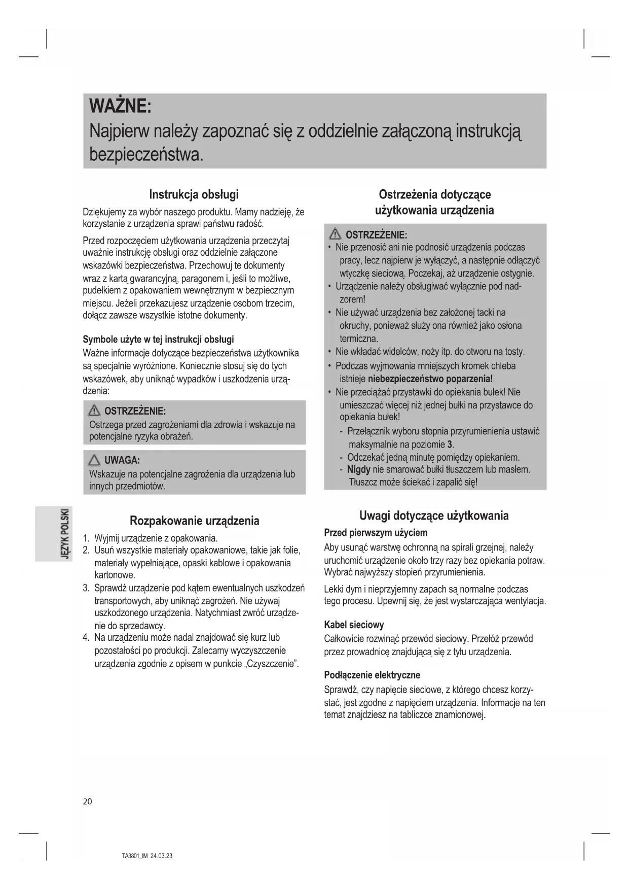 - Nie przeciążać przystawki do opiekania bułek! Nie umieszczać więcej niż jednej bułki na przystawce do opiekania bułek! - Przełącznik wyboru stopnia przyrumienienia ustawić maksymalnie na poziomie 3. - Odczekać jedną minutę pomiędzy opiekaniem. - Nigdy nie smarować bułki tłuszczem lub masłem. Tłuszcz może ściekać i zapalić się! Uwagi dotyczące użytkowania Przed pierwszym użyciem Aby usunąć warstwę ochronną na spirali grzejnej, należy uruchomić urządzenie około trzy razy bez opiekania potraw. Wybrać najwyższy stopień przyrumienienia. Lekki dym i nieprzyjemny zapach są normalne podczas tego procesu. Upewnij się, że jest wystarczająca wentylacja. Kabel sieciowy Całkowicie rozwinąć przewód sieciowy. Przełóż przewód przez prowadnicę znajdującą się z tyłu urządzenia. Podłączenie elektryczne Sprawdź, czy napięcie sieciowe, z którego chcesz korzy- stać, jest zgodne z napięciem urządzenia. Informacje na ten temat znajdziesz na tabliczce znamionowej.TA3801_IM 24.03.23