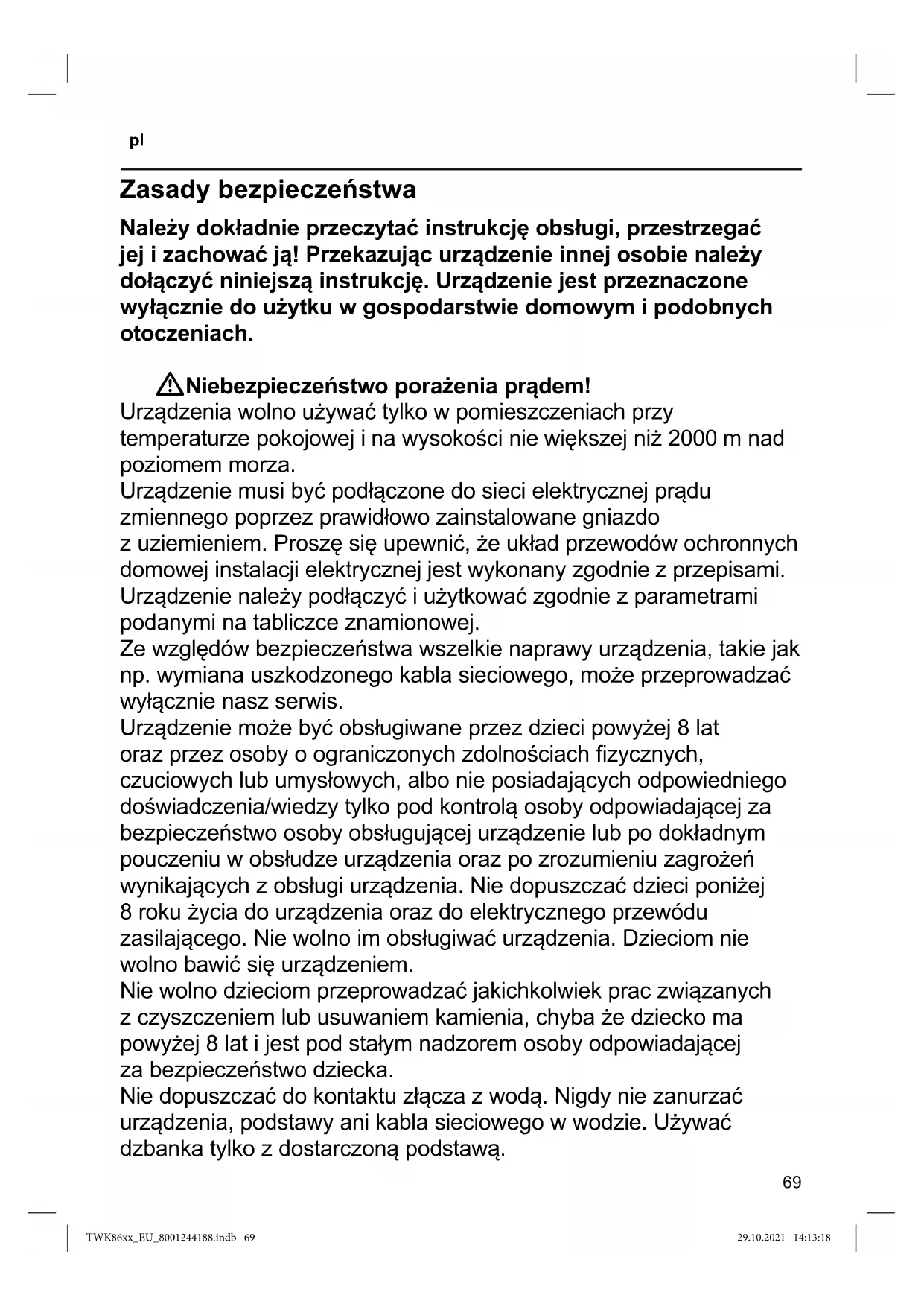 OSTRZEŻENIE: urządzenia tego nie używać w pobliżu wanien, pryszniców, umywalek lub innych zbiorników zawierających wodę. WRyzyko uduszenia! Nie zezwalać dzieciom na zabawę opakowaniem, a szczególnie folią. WNiebezpieczeństwo odniesienia obrażeń! Nieodpowiednie używanie urządzenia może prowadzić do powstania obrażeń. WUwaga! Czyszczenie powierzchni mających kontakt z żywnością! Należy przestrzegać specjalnych wymagań dotyczących czyszczenia, podanych w instrukcji. TWK86xx_EU_8001244188.indb 70TWK86xx_EU_8001244188.indb 70 29.10.2021 14:13:1829.10.2021 14:13:1871