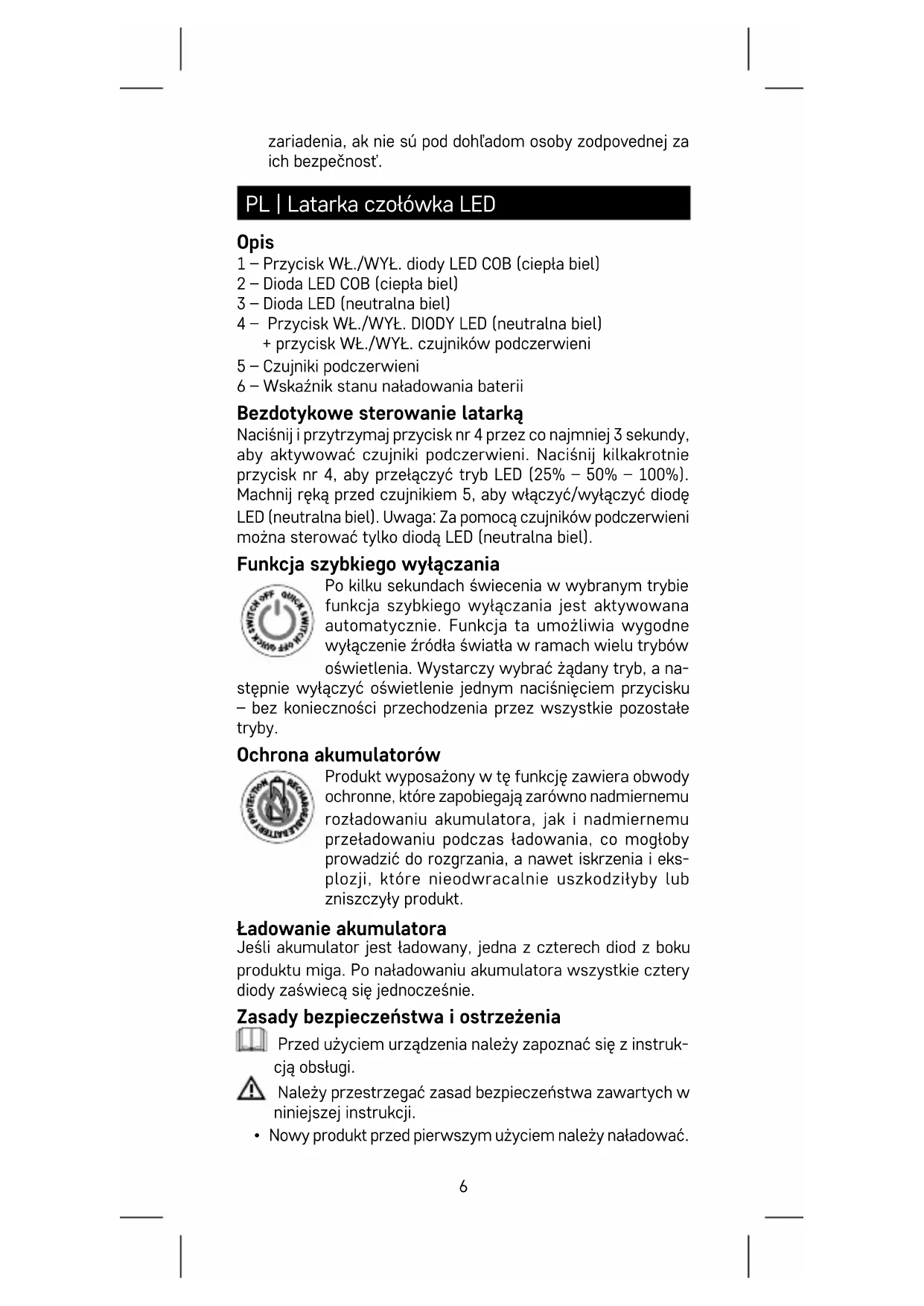 - Toto zariadenie nesmú obsluhovať deti alebo osoby, ktorých fyzická, zmyslová alebo mentálna neschopnosť alebo nedo- statok skúseností a znalostí im bráni v bezpečnom používaní6 zariadenia, ak nie sú pod dohľadom osoby zodpovednej za ich bezpečnosť. PL | Latarka czołówka LED Opis 1 – Przycisk WŁ./WYŁ. diody LED COB (ciepła biel) 2 – Dioda LED COB (ciepła biel) 3 – Dioda LED (neutralna biel) 4 – Przycisk WŁ./WYŁ. DIODY LED (neutralna biel) + przycisk WŁ./WYŁ. czujników podczerwieni 5 – Czujniki podczerwieni 6 – Wskaźnik stanu naładowania baterii Bezdotykowe sterowanie latarką Naciśnij i przytrzymaj przycisk nr 4 przez co najmniej 3 sekundy, aby aktywować czujniki podczerwieni. Naciśnij kilkakrotnie przycisk nr 4, aby przełączyć tryb LED (25% – 50% – 100%). Machnij ręką przed czujnikiem 5, aby włączyć/wyłączyć diodę LED (neutralna biel). Uwaga: Za pomocą czujników podczerwieni można sterować tylko diodą LED (neutralna biel). Funkcja szybkiego wyłączania Po kilku sekundach świecenia w wybranym trybie funkcja szybkiego wyłączania jest aktywowana automatycznie. Funkcja ta umożliwia wygodne wyłączenie źródła światła w ramach wielu trybów oświetlenia. Wystarczy wybrać żądany tryb, a na- stępnie wyłączyć oświetlenie jednym naciśnięciem przycisku – bez konieczności przechodzenia przez wszystkie pozostałe tryby. Ochrona akumulatorów Produkt wyposażony w tę funkcję zawiera obwody ochronne, które zapobiegają zarówno nadmiernemu rozładowaniu akumulatora, jak i nadmiernemu przeładowaniu podczas ładowania, co mogłoby prowadzić do rozgrzania, a nawet iskrzenia i eks- plozji, które nieodwracalnie uszkodziłyby lub zniszczyły produkt. Ładowanie akumulatora Jeśli akumulator jest ładowany, jedna z czterech diod z boku produktu miga. Po naładowaniu akumulatora wszystkie cztery diody zaświecą się jednocześnie. Zasady bezpieczeństwa i ostrzeżenia Przed użyciem urządzenia należy zapoznać się z instruk- cją obsługi. Należy przestrzegać zasad bezpieczeństwa zawartych w niniejszej instrukcji.