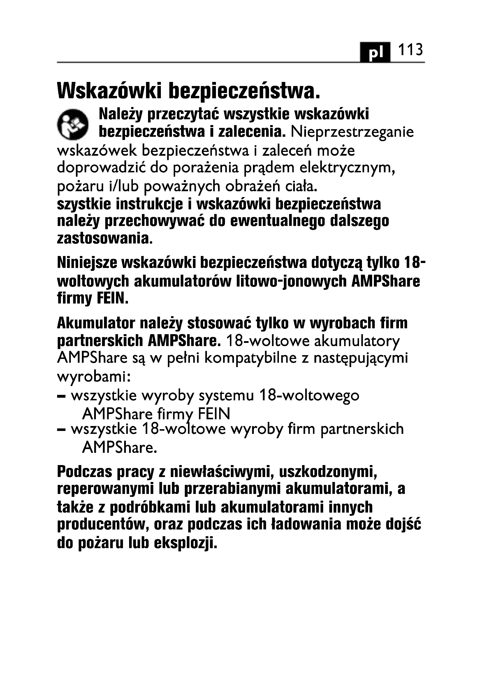 Wskazówki bezpieczeństwa. Należy przeczytać wszystkie wskazówki bezpieczeństwa i zalecenia. Nieprzestrzeganie wskazówek bezpieczeństwa i zaleceń może doprowadzić do porażenia prądem elektrycznym, pożaru i/lub poważnych obrażeń ciała. szystkie instrukcje i wskazówki bezpieczeństwa należy przechowywać do ewentualnego dalszego zastosowania. Niniejsze wskazówki bezpieczeństwa dotyczą tylko 18- woltowych akumulatorów litowo-jonowych AMPShare firmy FEIN. Akumulator należy stosować tylko w wyrobach firm partnerskich AMPShare. 18-woltowe akumulatory AMPShare są w pełni kompatybilne z następującymi wyrobami: – wszystkie wyroby systemu 18-woltowego AMPShare firmy FEIN – wszystkie 18-woltowe wyroby firm partnerskich AMPShare. Podczas pracy z niewłaściwymi, uszkodzonymi, reperowanymi lub przerabianymi akumulatorami, a także z podróbkami lub akumulatorami innych producentów, oraz podczas ich ładowania może dojść do pożaru lub eksplozji.114