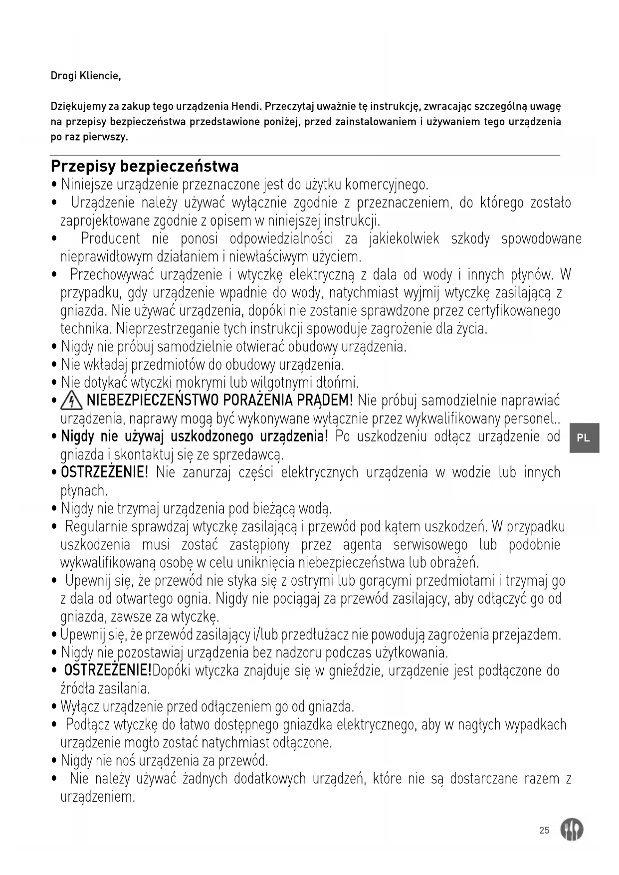Drogi Kliencie, Dziękujemy za zakup tego urządzenia Hendi. Przeczytaj uważnie tę instrukcję, zwracając szczególną uwagę na przepisy bezpieczeństwa przedstawione poniżej, przed zainstalowaniem i używaniem tego urządzenia po raz pierwszy. Przepisy bezpieczeństwa