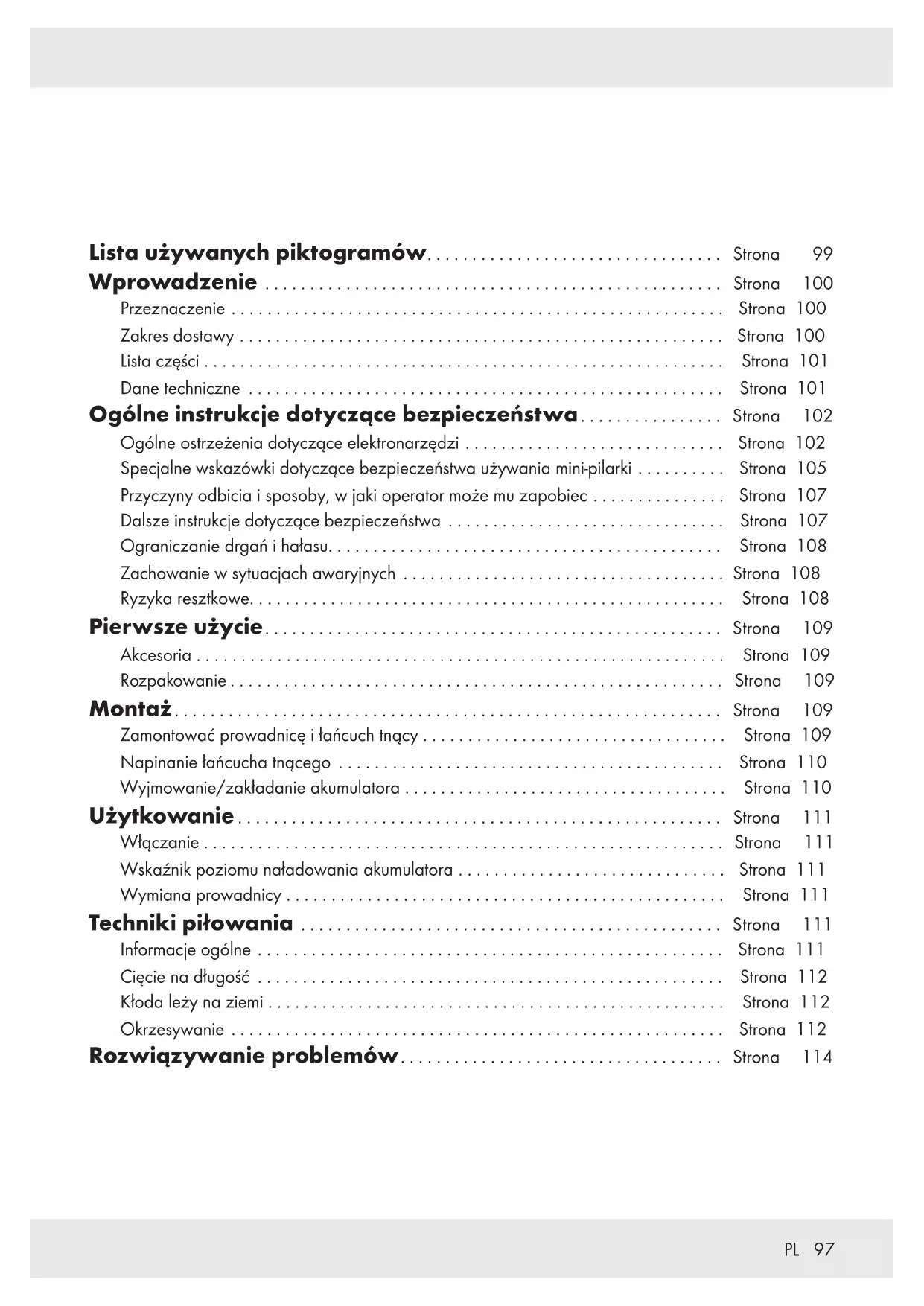 OSTRZEŻENIE! u Produkt i jego opakowanie nie są zabawkami dla dzieci! Dzieciom nie wolno bawić się woreczkami plastikowymi, folią i małymi elementami! Przedmioty te stwarzają ryzyko zadławienia i uduszenia! 1x akumulatorowa pilarka do roślin zdrewniałych 1x prowadnica (już zamontowana) 1x łańcuch tnący (już zamontowany) 1x osłona zabezpieczająca na prowadnicę 1x butelka z 50ml bio oleju do smarowania łańcuchów 1x instrukcja obsługi101