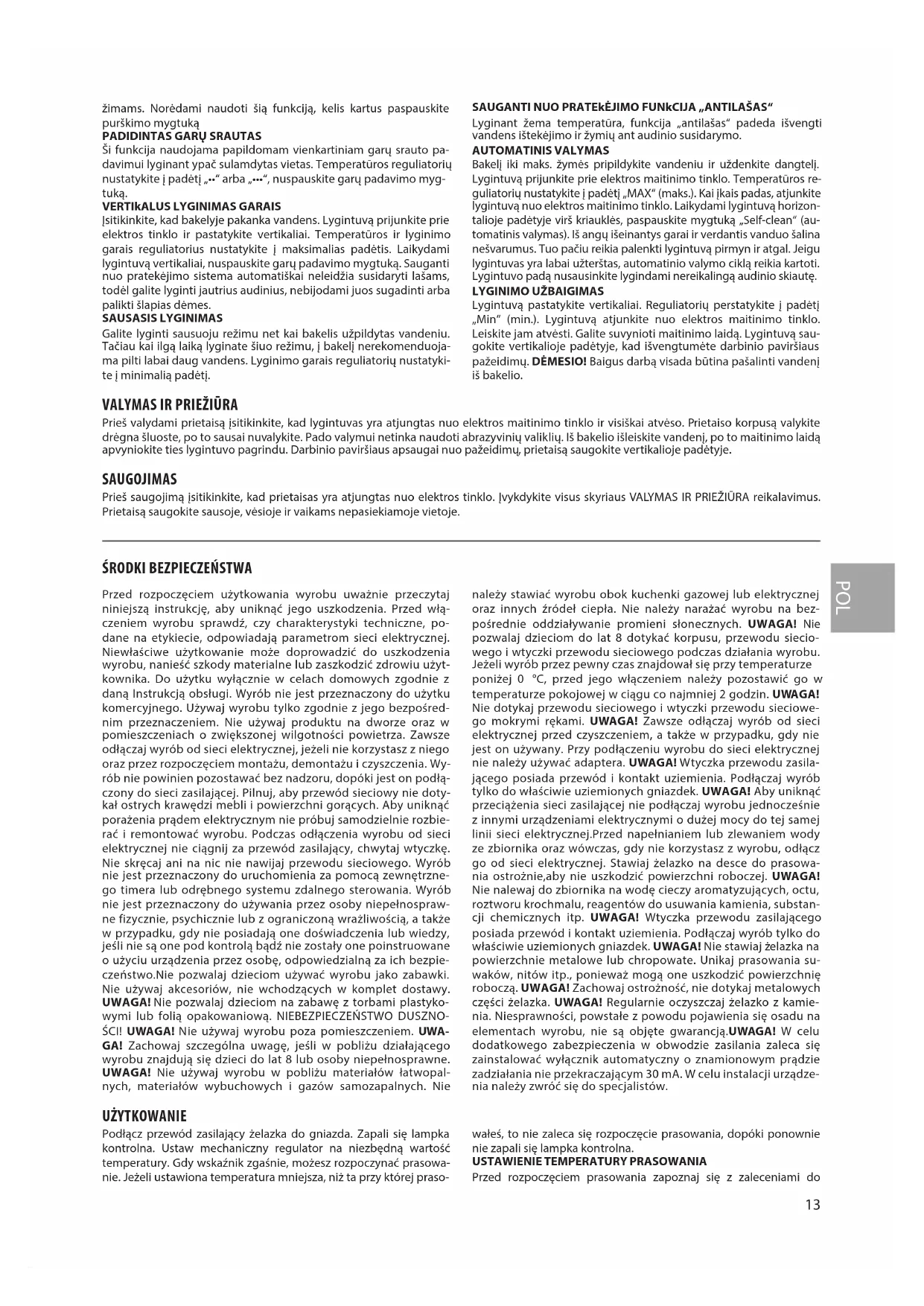Lygintuvą pastatykite vertikaliai. Reguliatorių perstatykite į padėtį „Min“ (min.). Lygintuvą atjunkite nuo elektros maitinimo tinklo. Leiskite jam atvėsti. Galite suvynioti maitinimo laidą. Lygintuvą sau- gokite vertikalioje padėtyje, kad išvengtumėte darbinio paviršiaus pažeidimų. DĖMESIO! Baigus darbą visada būtina pašalinti vandenį iš bakelio. VAlYMAS IR PRIEŽIŪRA Prieš valydami prietaisą įsitikinkite, kad lygintuvas yra atjungtas nuo elektros maitinimo tinklo ir visiškai atvėso. Prietaiso korpusą valykite drėgna šluoste, po to sausai nuvalykite. Pado valymui netinka naudoti abrazyvinių valiklių. Iš bakelio išleiskite vandenį, po to maitinimo laidą apvyniokite ties lygintuvo pagrindu. Darbinio paviršiaus apsaugai nuo pažeidimų, prietaisą saugokite vertikalioje padėtyje. SAUGOJIMAS Prieš saugojimą įsitikinkite, kad prietaisas yra atjungtas nuo elektros tinklo. Įvykdykite visus skyriaus VALYMAS IR PRIEŽIŪRA reikalavimus. Prietaisą saugokite sausoje, vėsioje ir vaikams nepasiekiamoje vietoje. śRODKI bEzPIECzEŃSTwA Przed rozpoczęciem użytkowania wyrobu uważnie przeczytaj niniejszą instrukcję, aby uniknąć jego uszkodzenia. Przed włą- czeniem wyrobu sprawdź, czy charakterystyki techniczne, po- dane na etykiecie, odpowiadają parametrom sieci elektrycznej. Niewłaściwe użytkowanie może doprowadzić do uszkodzenia wyrobu, nanieść szkody materialne lub zaszkodzić zdrowiu użyt- kownika. Do użytku wyłącznie w celach domowych zgodnie z daną Instrukcją obsługi. Wyrób nie jest przeznaczony do użytku komercyjnego. Używaj wyrobu tylko zgodnie z jego bezpośred- nim przeznaczeniem. Nie używaj produktu na dworze oraz w pomieszczeniach o zwiększonej wilgotności powietrza. Zawsze odłączaj wyrób od sieci elektrycznej, jeżeli nie korzystasz z niego oraz przez rozpoczęciem montażu, demontażu i czyszczenia. Wy- rób nie powinien pozostawać bez nadzoru, dopóki jest on podłą- czony do sieci zasilającej. Pilnuj, aby przewód sieciowy nie doty- kał ostrych krawędzi mebli i powierzchni gorących. Aby uniknąć porażenia prądem elektrycznym nie próbuj samodzielnie rozbie- rać i remontować wyrobu. Podczas odłączenia wyrobu od sieci elektrycznej nie ciągnij za przewód zasilający, chwytaj wtyczkę. Nie skręcaj ani na nic nie nawijaj przewodu sieciowego. Wyrób nie jest przeznaczony do uruchomienia za pomocą zewnętrzne- go timera lub odrębnego systemu zdalnego sterowania. Wyrób nie jest przeznaczony do używania przez osoby niepełnospraw- ne fizycznie, psychicznie lub z ograniczoną wrażliwością, a także w przypadku, gdy nie posiadają one doświadczenia lub wiedzy, jeśli nie są one pod kontrolą bądź nie zostały one poinstruowane o użyciu urządzenia przez osobę, odpowiedzialną za ich bezpie- czeństwo.Nie pozwalaj dzieciom używać wyrobu jako zabawki. Nie używaj akcesoriów, nie wchodzących w komplet dostawy. UWAGA! Nie pozwalaj dzieciom na zabawę z torbami plastyko- wymi lub folią opakowaniową. NIEBEZPIECZEŃSTWO DUSZNO- ŚCI! UWAGA! Nie używaj wyrobu poza pomieszczeniem. UWA- GA! Zachowaj szczególna uwagę, jeśli w pobliżu działającego wyrobu znajdują się dzieci do lat 8 lub osoby niepełnosprawne. UWAGA! Nie używaj wyrobu w pobliżu materiałów łatwopal- nych, materiałów wybuchowych i gazów samozapalnych. Nie należy stawiać wyrobu obok kuchenki gazowej lub elektrycznej oraz innych źródeł ciepła. Nie należy narażać wyrobu na bez- pośrednie oddziaływanie promieni słonecznych. UWAGA! Nie pozwalaj dzieciom do lat 8 dotykać korpusu, przewodu siecio- wego i wtyczki przewodu sieciowego podczas działania wyrobu. Jeżeli wyrób przez pewny czas znajdował się przy temperaturze poniżej 0 °C, przed jego włączeniem należy pozostawić go w temperaturze pokojowej w ciągu co najmniej 2 godzin. UWAGA! Nie dotykaj przewodu sieciowego i wtyczki przewodu sieciowe- go mokrymi rękami. UWAGA! Zawsze odłączaj wyrób od sieci elektrycznej przed czyszczeniem, a także w przypadku, gdy nie jest on używany. Przy podłączeniu wyrobu do sieci elektrycznej nie należy używać adaptera. UWAGA! Wtyczka przewodu zasila- jącego posiada przewód i kontakt uziemienia. Podłączaj wyrób tylko do właściwie uziemionych gniazdek. UWAGA! Aby uniknąć przeciążenia sieci zasilającej nie podłączaj wyrobu jednocześnie z innymi urządzeniami elektrycznymi o dużej mocy do tej samej linii sieci elektrycznej.Przed napełnianiem lub zlewaniem wody ze zbiornika oraz wówczas, gdy nie korzystasz z wyrobu, odłącz go od sieci elektrycznej. Stawiaj żelazko na desce do prasowa- nia ostrożnie,aby nie uszkodzić powierzchni roboczej. UWAGA! Nie nalewaj do zbiornika na wodę cieczy aromatyzujących, octu, roztworu krochmalu, reagentów do usuwania kamienia, substan- cji chemicznych itp. UWAGA! Wtyczka przewodu zasilającego posiada przewód i kontakt uziemienia. Podłączaj wyrób tylko do właściwie uziemionych gniazdek. UWAGA! Nie stawiaj żelazka na powierzchnie metalowe lub chropowate. Unikaj prasowania su- waków, nitów itp., ponieważ mogą one uszkodzić powierzchnię roboczą. UWAGA! Zachowaj ostrożność, nie dotykaj metalowych części żelazka. UWAGA! Regularnie oczyszczaj żelazko z kamie- nia. Niesprawności, powstałe z powodu pojawienia się osadu na elementach wyrobu, nie są objęte gwarancją.UWAGA! W celu dodatkowego zabezpieczenia w obwodzie zasilania zaleca się zainstalować wyłącznik automatyczny o znamionowym prądzie zadziałania nie przekraczającym 30 mA. W celu instalacji urządze- nia należy zwróć się do specjalistów. UŻYTKOwANIE Podłącz przewód zasilający żelazka do gniazda. Zapali się lampka kontrolna. Ustaw mechaniczny regulator na niezbędną wartość temperatury. Gdy wskaźnik zgaśnie, możesz rozpoczynać prasowa- nie. Jeżeli ustawiona temperatura mniejsza, niż ta przy której praso- wałeś, to nie zaleca się rozpoczęcie pras