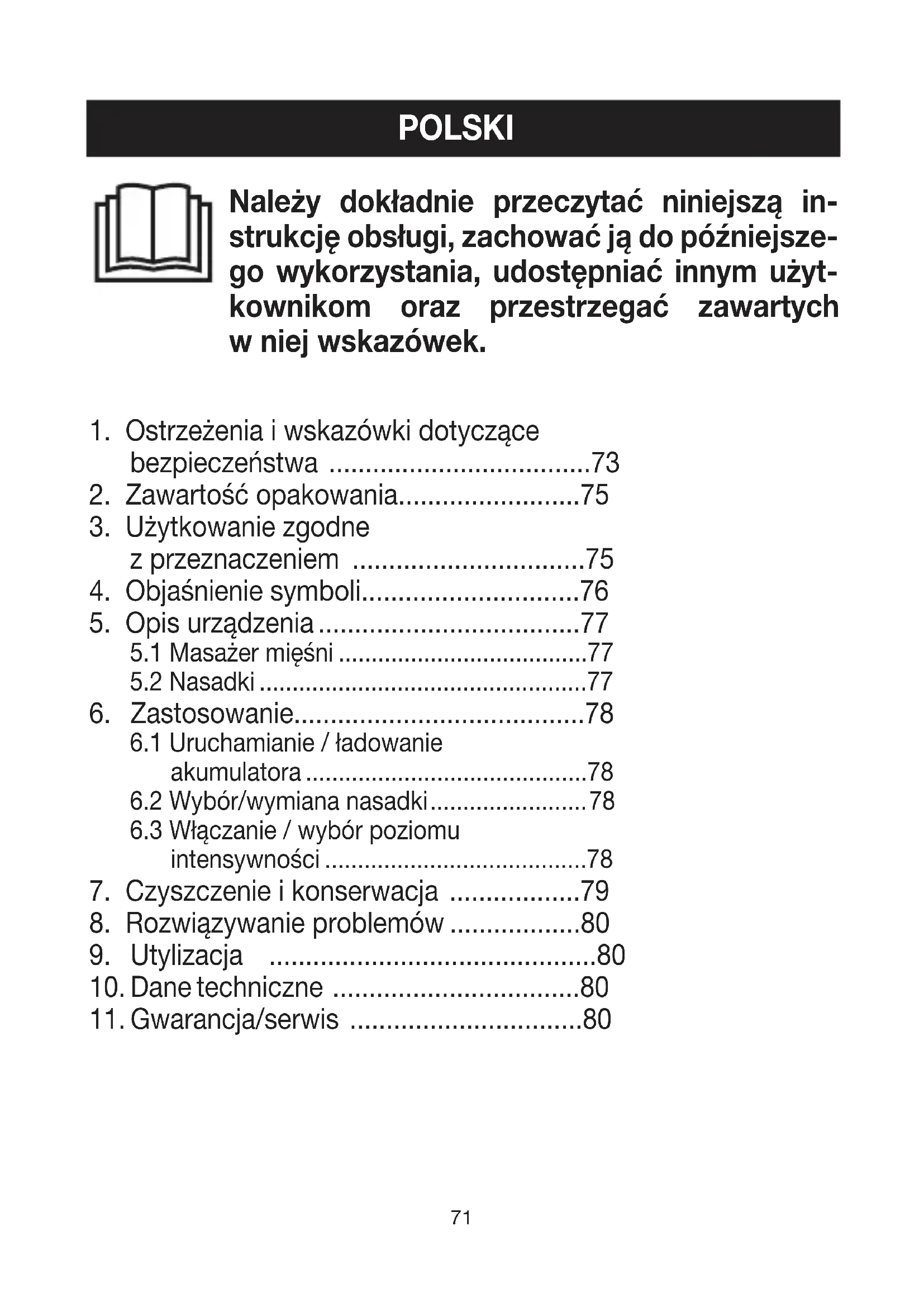 nie do użytku domowego inie może służyć do celów medycznych ani komercyjnych. Urządzenie może być używane wyłącznie do celu, w jakim zostało zaprojektowane, iwsposób określony wniniejszej instrukcji obsługi. Nieprawidłowe użycie może być76 niebezpieczne! Producent nie ponosi odpo- wiedzialności za szkody wynikające z nie- właściwego użytkowania urządzenia. Masa- żera mięśni nie należy używać wprzypadku wystąpienia jednego lub więcej z poniż