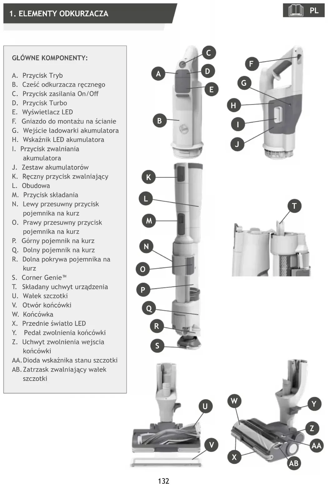 AC. Przycisk zwalniający mini pojemnik AD. Mini pojemnik AE. Przycisk zwalniający klapę mini pojemnika AF. Filtr 2w1 AG. Ładowarka AH. Śruby i akcesoria wspornika do montażu na ścianie AI. Mini turboszczotka PET