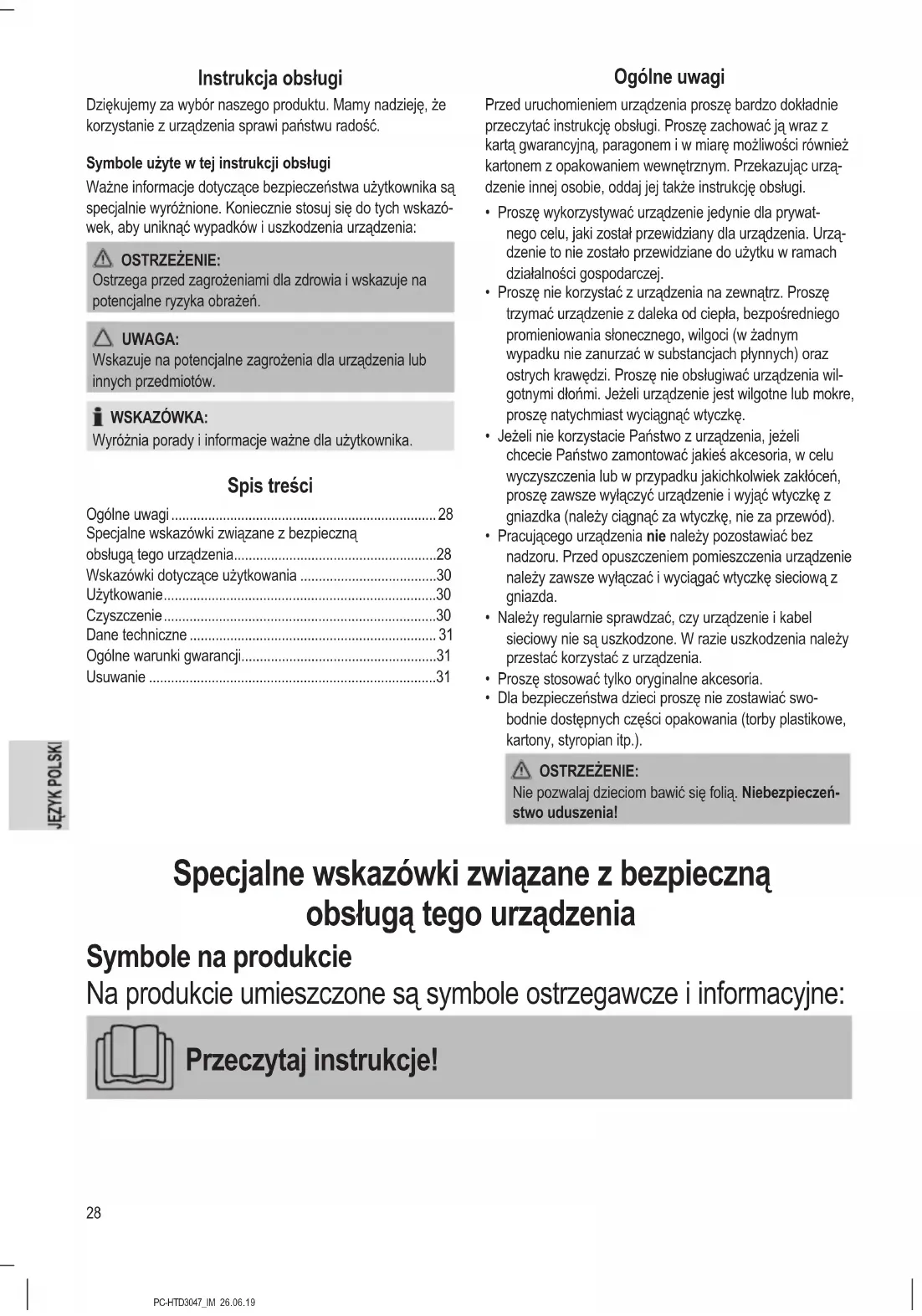 Technical Data Model:.................................................................PC-HTD 3047 Power supply:................................................230 V~, 50 / 60 Hz Power consumption: .....................................................2200 W Protection class: ....................................................................Ⅱ Net weight: ....................................................... approx. 0.55 kg27 PC-HTD3047_IM 26.06.19 The right to make technical and design modications in the course of continuous product development remains reserved. This appliance has been tested according to all relevant current CE guidelines, such as electromagnetic compatibility and low voltage directives, and has been constructed in accordance with the latest regulations. Disposal Meaning of the “Dustbin” Symbol Protect our environment: do not dispose of elec- trical equipment in the domestic waste. Please return any electrical equipment that you will no longer use to the collection points provided for their disposal. This helps avoid the potential effects of incorrect disposal on the environment and human health. This will contribute to the recycling and other forms of reutili- sation of electrical and electronic equipment. Information concerning where the equipment can be dis- posed of can be obtained from your local authority.28 PC-HTD3047_IM 26.06.19 Instrukcja obsługi Dziękujemy za wybór naszego produktu. Mamy nadzieję, że korzystanie z urządzenia sprawi państwu radość. Symbole użyte w tej instrukcji obsługi Ważne informacje dotyczące bezpieczeństwa użytkownika są specjalnie wyróżnione. Koniecznie stosuj się do tych wskazó- wek, aby uniknąć wypadków i uszkodzenia urządzenia: OSTRZEŻENIE: Ostrzega przed zagrożeniami dla zdrowia i wskazuje na potencjalne ryzyka obrażeń. UWAGA: Wskazuje na potencjalne zagrożenia dla urządzenia lub innych przedmiotów. WSKAZÓWKA: Wyróżnia porady i informacje ważne dla użytkownika. Spis treści Ogólne uwagi ........................................................................ 28 Specjalne wskazówki związane z bezpieczną obsługą tego urządzenia .......................................................28 Wskazówki dotyczące użytkowania .....................................30 Użytkowanie ..........................................................................30 Czyszczenie ..........................................................................30 Dane techniczne ................................................................... 31 Ogólne warunki gwarancji .....................................................31 Usuwanie ..............................................................................31 Ogólne uwagi Przed uruchomieniem urządzenia proszę bardzo dokładnie przeczytać instrukcję obsługi. Proszę zachować ją wraz z kartą gwarancyjną, paragonem i w miarę możliwości również kartonem z opakowaniem wewnętrznym. Przekazując urzą- dzenie innej osobie, oddaj jej także instrukcję obsługi.