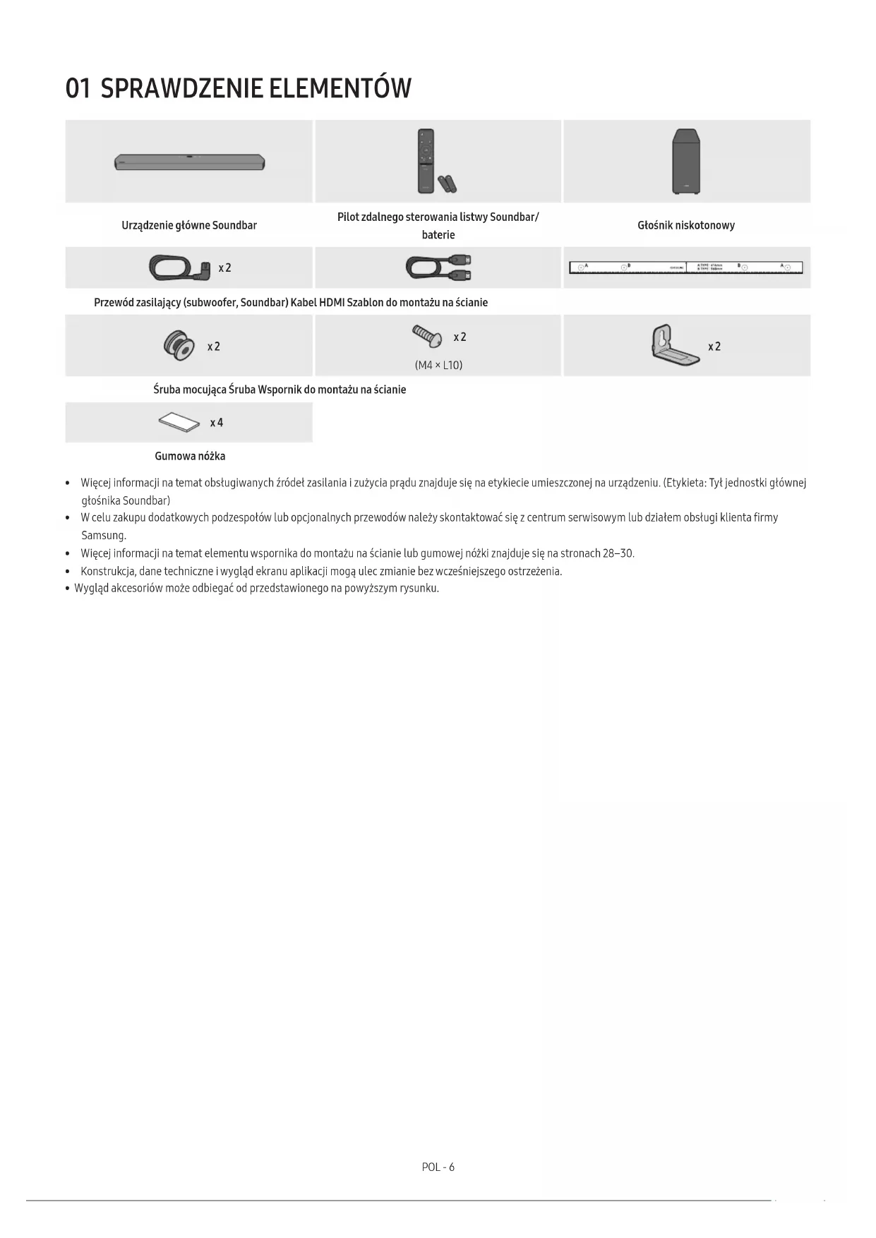 VOL WOOFER SOUNDBAR SOUND MODE PAIR Urządzenie główne Soundbar Pilot zdalnego sterowania listwy Soundbar/ baterie Głośnik niskotonowy x 2 Przewód zasilający (subwoofer, Soundbar) Kabel HDMI Szablon do montażu na ścianie x 2 x 2 (M4 × L10) x 2 Śruba mocująca Śruba Wspornik do montażu na ścianie x 4 Gumowa nóżka