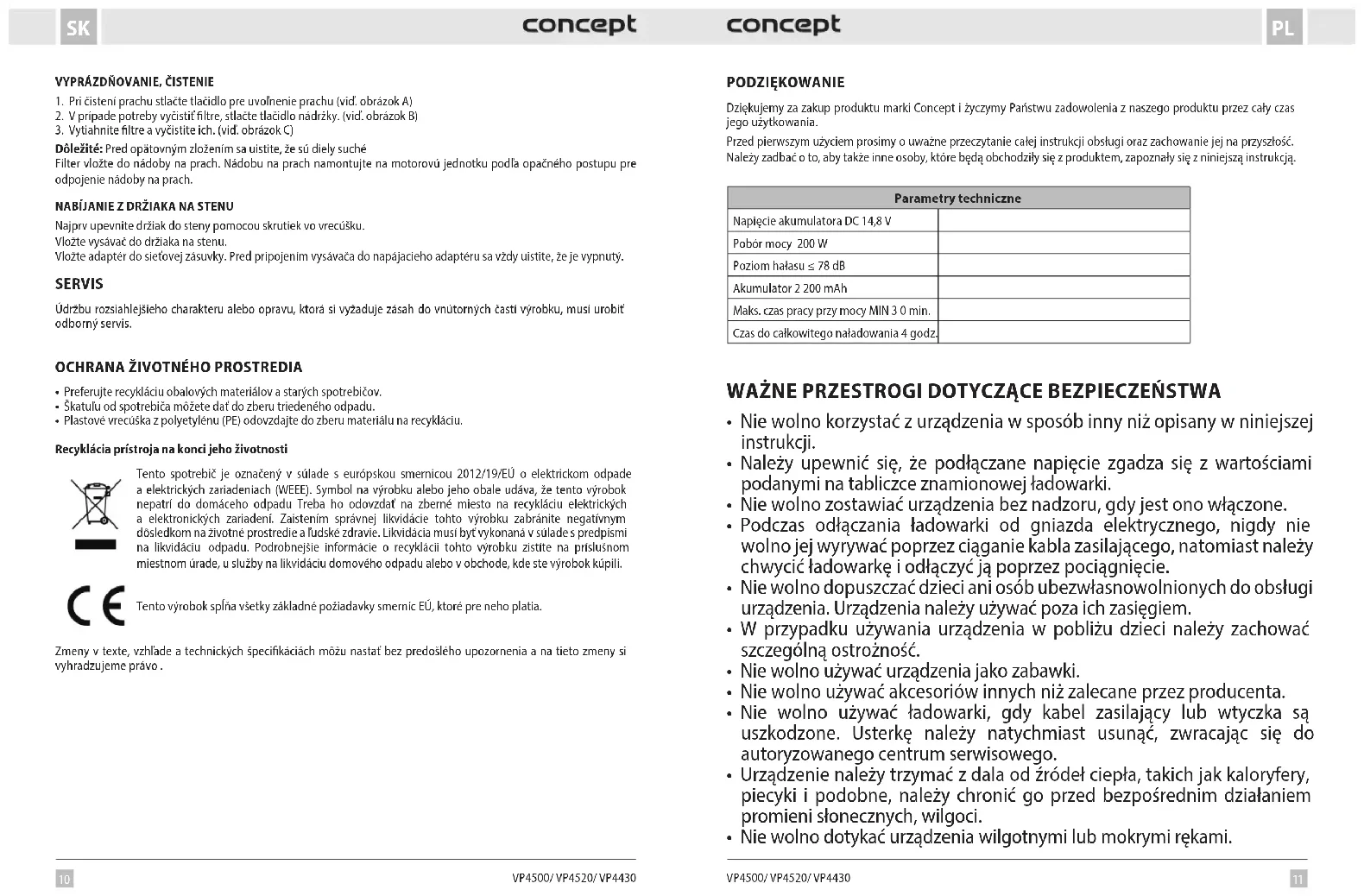 VP4430 - Odkurzacz Concept - Bezpłatna instrukcja obsługi