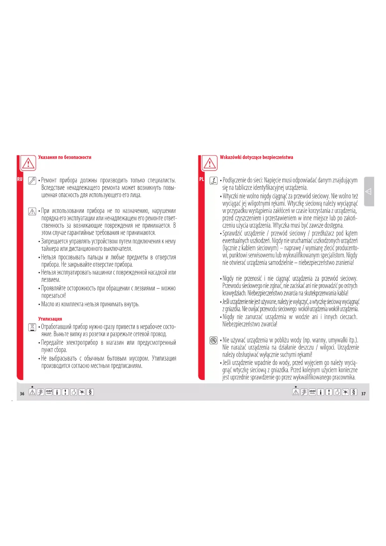 - Nigdy nie zanurzać urządzenia w wodzie ani i innych cieczach. Niebezpieczeństwo zwarcia! Указания по безопасности