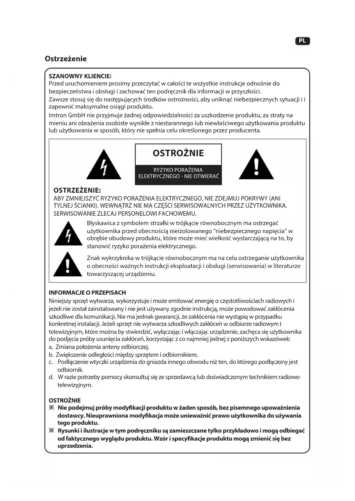 1331088PL SZANOWNY KLIENCIE: Przed uruchomieniem prosimy przeczytać w całości te wszystkie instrukcje odnośnie do bezpieczeństwa i obsługi i zachować ten podręcznik dla informacji w przyszłości. Zawsze stosuj się do następujących środków ostrożności, aby uniknąć niebezpiecznych sytuacji i i zapewnić maksymalne osiągi produktu. Imtron GmbH nie przyjmuje żadnej odpowiedzialności za uszkodzenie produktu, za straty na mieniu ani obrażenia osobiste wynikłe z niestarannego lub niewłaściwego użytkowania produktu lub użytkowania w sposób, który nie spełnia celu określonego przez producenta. Ostrzeżenie OSTRZEŻENIE: ABY ZMNIEJSZYĆ RYZYKO PORAŻENIA ELEKTRYCZNEGO, NIE ZDEJMUJ POKRYWY (ANI TYLNEJ ŚCIANKI). WEWNĄTRZ NIE MA CZĘŚCI SERWISOWALNYCH PRZEZ UŻYTKOWNIKA. SERWISOWANIE ZLECAJ PERSONELOWI FACHOWEMU. Błyskawica z symbolem strzałki w trójkącie równobocznym ma ostrzegać użytkownika przed obecnością nieizolowanego “niebezpiecznego napięcia” w obrębie obudowy produktu, które może mieć wielkość wystarczającą na to, by stanowić ryzyko porażenia elektrycznego. Znak wykrzyknika w trójkącie równobocznym ma na celu ostrzeganie użytkownika o obecności ważnych instrukcji eksploatacji i obsługi (serwisowania) w literaturze towarzyszącej urządzeniu.