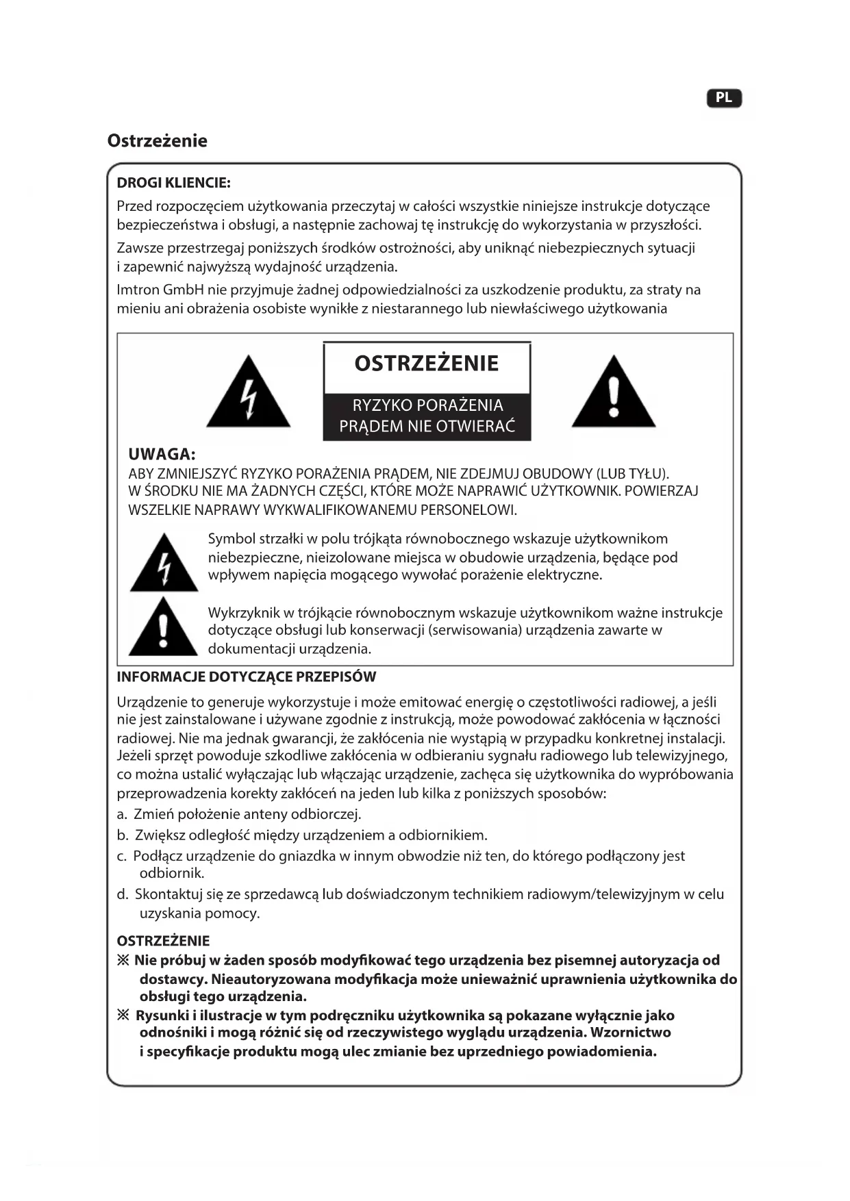 162PL DROGI KLIENCIE: Przed rozpoczęciem użytkowania przeczytaj w całości wszystkie niniejsze instrukcje dotyczące bezpieczeństwa i obsługi, a następnie zachowaj tę instrukcję do wykorzystania w przyszłości. Zawsze przestrzegaj poniższych środków ostrożności, aby uniknąć niebezpiecznych sytuacji i zapewnić najwyższą wydajność urządzenia. Imtron GmbH nie przyjmuje żadnej odpowiedzialności za uszkodzenie produktu, za straty na mieniu ani obrażenia osobiste wynikłe z niestarannego lub niewłaściwego użytkowania Ostrzeżenie UWAGA: ABY ZMNIEJSZYĆ RYZYKO PORAŻENIA PRĄDEM, NIE ZDEJMUJ OBUDOWY (LUB TYŁU). W ŚRODKU NIE MA ŻADNYCH CZĘŚCI, KTÓRE MOŻE NAPRAWIĆ UŻYTKOWNIK. POWIERZAJ WSZELKIE NAPRAWY WYKWALIFIKOWANEMU PERSONELOWI. Symbol strzałki w polu trójkąta równobocznego wskazuje użytkownikom niebezpieczne, nieizolowane miejsca w obudowie urządzenia, będące pod wpływem napięcia mogącego wywołać porażenie elektryczne. Wykrzyknik w trójkącie równobocznym wskazuje użytkownikom ważne instrukcje dotyczące obsługi lub konserwacji (serwisowania) urządzenia zawarte w dokumentacji urządzenia.