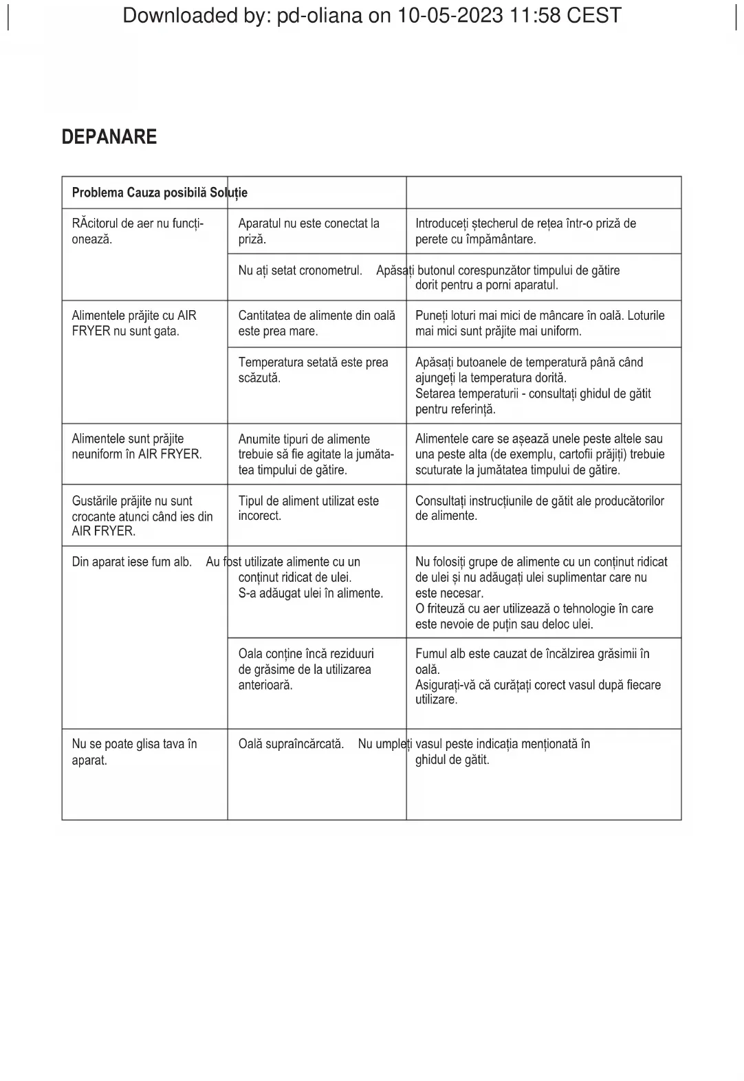 Problem Możliwa przyczyna Rozwiązanie NiedziałaAIRFRYER. Urządzenieniejestpodłączone doprądu. Włóżwtyczkęsieciowądouziemionegogniazdka ściennego. Nieustawiłeśtimera. Nacisnąćprzyciskzgodniezwymaganymczasem gotowania,abywłączyćurządzenie. PotrawysmażonewAIR FRYERniesągotowe. Ilośćjedzeniawgarnkujest zbytduża. Dogarnkawkładajmniejszepartiejedzenia. Mniejszepartiesąsmażonebardziej równomiernie. Ustawionatemperaturajest zbytniska. Naciskajprzyciskitemperatury,ażosiągniesz pożądanątemperaturę. Ustawienietemperatury-patrzprzewodnik gotowaniawceluodniesienia. WAIRFRYERpotrawysą smażonenierównomiernie. Niektórerodzajeżywności wymagająwstrząśnięciaw połowieczasugotowania. Żywność,którależynasobielubwpoprzek(np. frytki)wymagawstrząśnięciawpołowieczasu gotowania. Smażoneprzekąskiniesą chrupiącepowyjściuzAIR FRYER. Użytoniewłaściwegorodzaju żywności. Należyzapoznaćsięzinstrukcjamigotowania producentówżywności. Zurządzeniawydobywasię białydym. Stosowanożywnośćodużej zawartościoleju. Dojedzeniazostałdodanyolej. Nienależystosowaćgruppokarmowych owysokiejzawartościolejulubdodawać dodatkowegooleju,któryniejestwymagany. Frytownicapowietrznawykorzystujetechnologię, wktórejwymaganajestmałailośćolejulubjego brak. Garnekzawierajeszcze pozostałościtłuszczuz poprzedniegoużytkowania. Białydymjestspowodowanynagrzewaniemsię tłuszczuwgarnku. Upewnijsię,żeprawidłowowyczyściszgarnekpo każdymużyciu. Niemożnawsunąćtacydo urządzenia. Garnekprzeładowany. Nienależynapełniaćgarnkapowyżejwskazania podanegowinstrukcjigotowania. Downloaded by: pd-oliana on 10-05-2023 11:58 CESTбългарск (Превод на извършените инструкции)