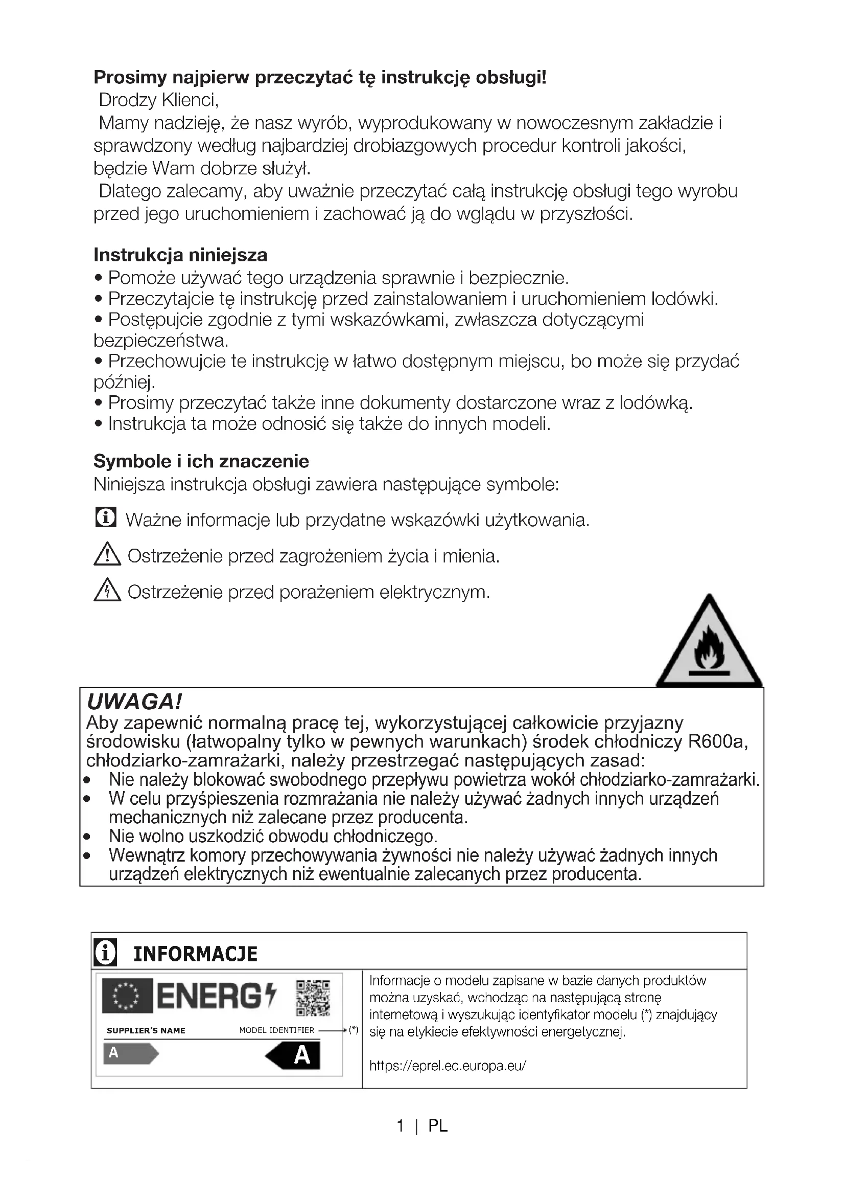 Ostrzeżenie przed zagrożeniem życia i mienia. Ostrzeżenie przed porażeniem elektrycznym. UWAGA! Aby zapewnić normalną pracę tej, wykorzystującej całkowicie przyjazny środowisku (łatwopalny tylko w pewnych warunkach) środek chłodniczy R600a, chłodziarko-zamrażarki, należy przestrzegać następujących zasad: Nie należy blokować swobodnego przepływu powietrza wokół chłodziarko-zamrażarki. W celu przyśpieszenia rozmrażania nie należy używać żadnych innych urządzeńmechanicznych niż zalecane przez producenta. Nie wolno uszkodzić obwodu chłodniczego. Wewnątrz komory przechowywania żywności nie należy używać żadnych innychurządzeń elektrycznych niż ewentualnie zalecanych przez producenta.