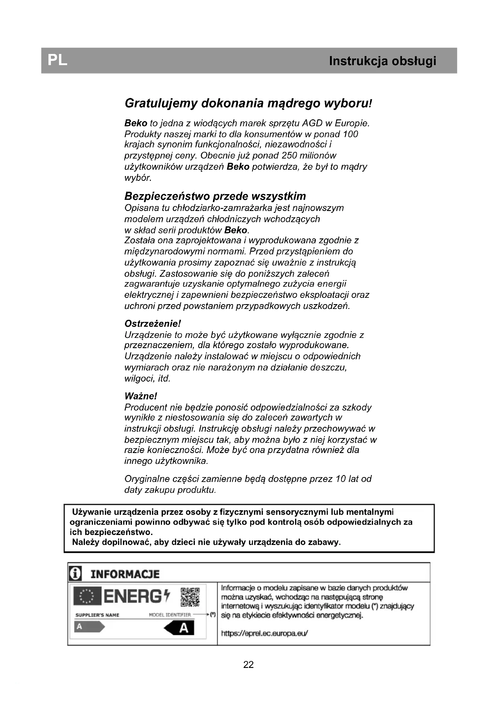 niż to konieczne i dbać o to, aby po każdym otwarciu starannie je zamykać. Importer: Beko S.A. ul. Puławska 366, 02-819 Warszawa www.beko.pl Wyprodukowano w RumuniiGwarancja jakości Twój produkt marki BEKO posiada gwarancję jakości udzieloną przez Beko S.A z siedzibą w Warszawie ul. Puławska 366, 02- 819 Warszawa (dalej Gwarant). Gwarancja jakości udzielana jest wyłącznie na produkty marki BEKO wprowadzane do obrotu na terytorium Rzeczypospolitej Polskiej przez Gwaranta. Termin gwarancji wynosi 24 miesiące od daty zakupu produktu. Oświadczenie gwarancyjne określające warunki gwarancji znajdziesz na stronie internetowej www.beko.pl w sekcji serwis. Warunkiem wykonywania uprawnień z gwarancji jest przedstawienie dowodu zakupu produktu lub zarejestrowanie produktu na stronie www.beko.pl w sekcji serwis.