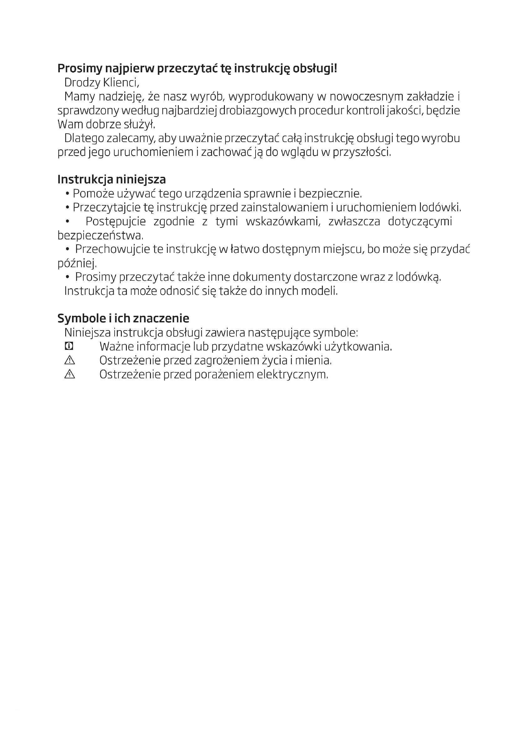 grubą taśmą i silnymi sznurkami i przestrzegać reguł transportu wydrukowanych na opakowaniu. Prosimy pamiętać... Wszystkie surowce wtórne stanowią niezbywalne źródło oszczędności zasobów naturalnych i krajowych. Osoby pragnące przyczynić się do wtórnego wykorzystania materiałów opakunkowych, mogą uzyskać dodatkowe informacje od instytucji ochrony środowiska lub władz lokalnych. Przed uruchomieniem chłodziarki