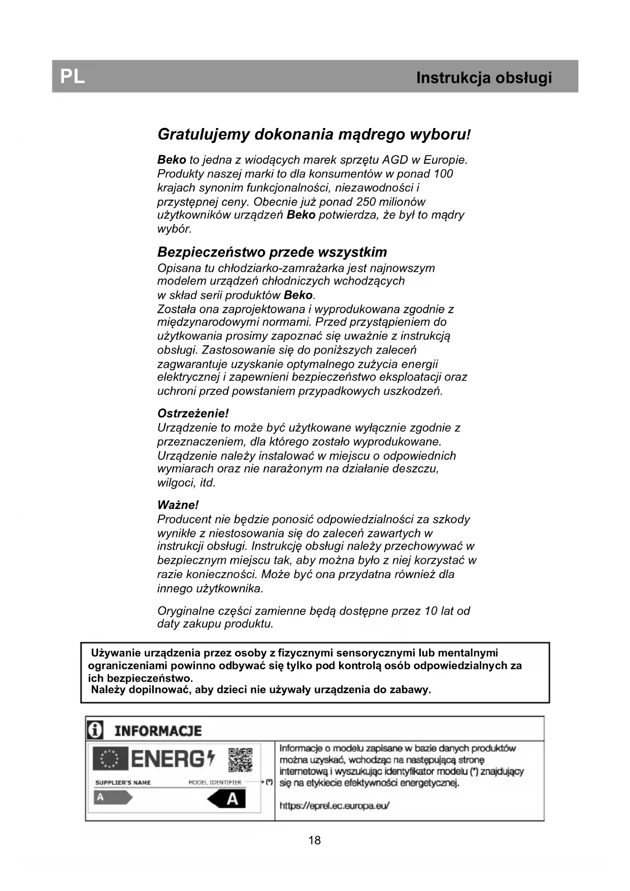 ereuses.Gratulujemy dokonania mądrego wyboru! Beko to jedna z wiodących marek sprzętu AGD w Europie. Produkty naszej marki to dla konsumentów w ponad 100 krajach synonim funkcjonalności, niezawodności i przystępnej ceny. Obecnie już ponad 250 milionów użytkowników urządzeń Beko potwierdza, że był to mądry wybór. Bezpieczeństwo przede wszystkim Opisana tu chłodziarko-zamrażarka jest najnowszym modelem urządzeń chłodniczych wchodzących w skład serii produktów Beko. Została ona zaprojektowana i wyprodukowana zgodnie z międzynarodowymi normami. Przed przystąpieniem do użytkowania prosimy zapoznać się uważnie z instrukcją obsługi. Zastosowanie się do poniższych zaleceń zagwarantuje uzyskanie optymalnego zużycia energii elektrycznej i zapewnieni bezpieczeństwo eksploatacji oraz uchroni przed powstaniem przypadkowych uszkodzeń. Ostrzeżenie! Urządzenie to może być użytkowane wyłącznie zgodnie z przeznaczeniem, dla którego zostało wyprodukowane. Urządzenie należy instalować w miejscu o odpowiednich wymiarach oraz nie narażonym na działanie deszczu, wilgoci, itd. Ważne! Producent nie będzie ponosić odpowiedzialności za szkody wynikłe z niestosowania się do zaleceń zawartych w instrukcji obsługi. Instrukcję obsługi należy przechowywać w bezpiecznym miejscu tak, aby można było z niej korzystać w razie konieczności. Może być ona przydatna również dla innego użytkownika. Oryginalne części zamienne będą dostępne przez 10 lat od daty zakupu produktu.