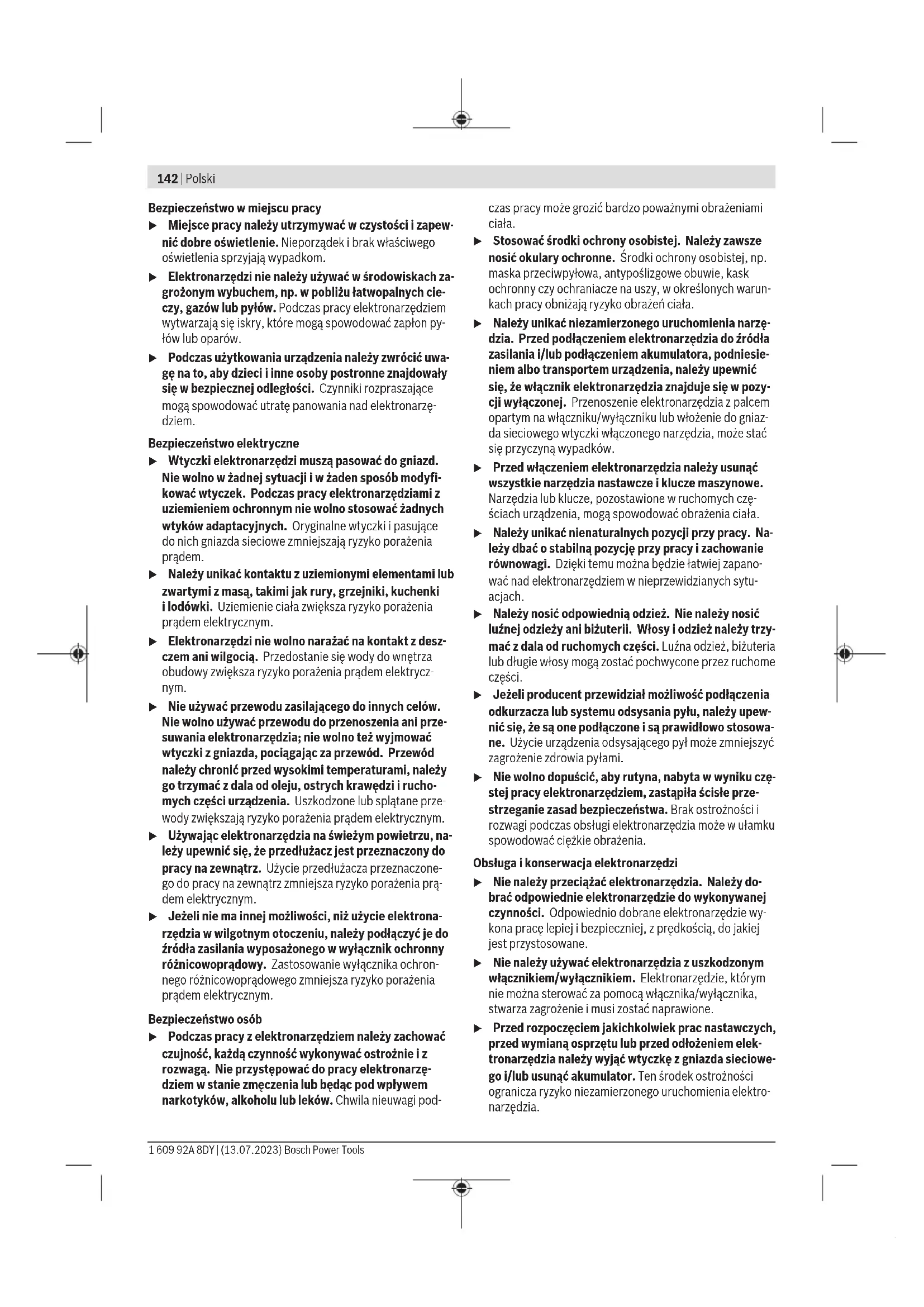 Karasoku Mahallesi 28028. Sokak No:20/A Merkez / ADANA Tel.: +903223599710 -3521379 Fax: +903223591323 E-mail: isiklar@isiklarelektrik.com Diğer servis adreslerini şurada bulabilirsiniz: www.bosch-pt.com/serviceaddresses Tasfiye Elektrikli el aleti, aksesuar ve ambalaj malzemesi çevre dostu bir yöntemle tasfiye edilmek üzere tekrar kazanım merkezine gönderilmelidir. Elektrikli el aletlerini evsel çöplerin içine atmayın! Sadece AB ülkeleri için: Eski elektrikli el aletleri ve elektronik aletlere ilişkin 2012/19/EU sayılı Avrupa Birliği yönetmeliği ve bunların tek tek ülkelerin hukuklarına uyarlanması uyarınca, kullanım ömrünü tamamlamış elektrikli el aletleri ayrı ayrı toplanmak ve çevre dostu bir yöntemle tasfiye edilmek üzere yeniden kazanım merkezlerine gönderilmek zorundadır. Atık elektrikli ve elektronik ekipmanlar uygun şekilde imha edilmezse olası tehlikeli maddelerin varlığı nedeniyle çevre ve insan sağlığı üzerinde zararlı etkileri olabilir. Polski Wskazówki bezpieczeństwa Ogólne wskazówki bezpieczeństwa dotyczące pracy z elektronarzędziami OSTRZEŻENIE Należy zapoznać się ze wszystkimi ostrzeżeniami i wskazówkami do- tyczącymi bezpieczeństwa użytkowania oraz ilustracjami i danymi technicznymi, dostarczonymi wraz z niniejszym elektronarzędziem. Nieprzestrzeganie poniższych wskazó- wek może stać się przyczyną porażenia prądem elektrycz- nym, pożaru i/lub poważnych obrażeń ciała. Należy zachować wszystkie przepisy i wskazówki bezpie- czeństwa dla dalszego zastosowania. Pojęcie "elektronarzędzie" odnosi się do elektronarzędzi za- silanych energią elektryczną z sieci (z przewodem zasilają- cym) i do elektronarzędzi zasilanych akumulatorami (bezprzewodu zasilającego). Bosch Power Tools 1 609 92A 8DY | (13.07.2023)142 | Polski Bezpieczeństwo w miejscu pracy u Miejsce pracy należy utrzymywać w czystości i zapew- nić dobre oświetlenie. Nieporządek i brak właściwego oświetlenia sprzyjają wypadkom. u Elektronarzędzi nie należy używać w środowiskach za- grożonym wybuchem, np. w pobliżu łatwopalnych cie- czy, gazów lub pyłów. Podczas pracy elektronarzędziem wytwarzają się iskry, które mogą spowodować zapłon py- łów lub oparów. u Podczas użytkowania urządzenia należy zwrócić uwa- gę na to, aby dzieci i inne osoby postronne znajdowały się w bezpiecznej odległości. Czynniki rozpraszające mogą spowodować utratę panowania nad elektronarzę- dziem. Bezpieczeństwo elektryczne u Wtyczki elektronarzędzi muszą pasować do gniazd. Nie wolno w żadnej sytuacji i w żaden sposób modyfi- kować wtyczek. Podczas pracy elektronarzędziami z uziemieniem ochronnym nie wolno stosować żadnych wtyków adaptacyjnych. Oryginalne wtyczki i pasujące do nich gniazda sieciowe zmniejszają ryzyko porażenia prądem. u Należy unikać kontaktu z uziemionymi elementami lub zwartymi z masą, takimi jak rury, grzejniki, kuchenki ilodówki. Uziemienie ciała zwiększa ryzyko porażenia prądem elektrycznym. u Elektronarzędzi nie wolno narażać na kontakt z desz- czem ani wilgocią. Przedostanie się wody do wnętrza obudowy zwiększa ryzyko porażenia prądem elektrycz- nym. u Nie używać przewodu zasilającego do innych celów. Nie wolno używać przewodu do przenoszenia ani prze- suwania elektronarzędzia; nie wolno też wyjmować wtyczki z gniazda, pociągając za przewód. Przewód należy chronić przed wysokimi temperaturami, należy go trzymać zdala od oleju, ostrych krawędzi i rucho- mych części urządzenia. Uszkodzone lub splątane prze- wody zwiększają ryzyko porażenia prądem elektrycznym. u Używając elektronarzędzia na świeżym powietrzu, na- leży upewnić się, że przedłużacz jest przeznaczony do pracy na zewnątrz. Użycie przedłużacza przeznaczone- go do pracy na zewnątrz zmniejsza ryzyko porażenia prą- dem elektrycznym. u Jeżeli nie ma innej możliwości, niż użycie elektrona- rzędzia w wilgotnym otoczeniu, należy podłączyć je do źródła zasilania wyposażonego w wyłącznik ochronny różnicowoprądowy. Zastosowanie wyłącznika ochron- nego różnicowoprądowego zmniejsza ryzyko porażenia prądem elektrycznym. Bezpieczeństwo osób u Podczas pracy z elektronarzędziem należy zachować czujność, każdą czynność wykonywać ostrożnie i z rozwagą. Nie przystępować do pracy elektronarzę- dziem w stanie zmęczenia lub będąc pod wpływem narkotyków, alkoholu lub leków. Chwila nieuwagi pod- czas pracy może grozić bardzo poważnymi obrażeniami ciała. u Stosować środki ochrony osobistej. Należy zawsze nosić okulary ochronne. Środki ochrony osobistej, np. maska przeciwpyłowa, antypoślizgowe obuwie, kask ochronny czy ochraniacze na uszy, w określonych warun- kach pracy obniżają ryzyko obrażeń ciała. u Należy unikać niezamierzonego uruchomienia narzę- dzia. Przed podłączeniem elektronarzędzia do źródła zasilania i/lub podłączeniem akumulatora, podniesie- niem albo transportem urządzenia, należy upewnić się, że włącznik elektronarzędzia znajduje się w pozy- cji wyłączonej. Przenoszenie elektronarzędzia z palcem opartym na włączniku/wyłączniku lub włożenie do gniaz- da sieciowego wtyczki włączonego narzędzia, może stać się przyczyną wypadków. u Przed włączeniem elektronarzędzia należy usunąć wszystkie narzędzia nastawcze i klucze maszynowe. Narzędzia lub klucze, pozostawione wruchomych czę- ściach urządzenia, mogą spowodować obrażenia ciała. u Należy unikać nienaturalnych pozycji przy pracy. Na- leży dbać o stabilną pozycję przy pracy i zachowanie równowagi. Dzięki temu można będzie łatwiej zapano- wać nad elektronarzędziem w nieprzewidzianych sytu- acjach. u Należy nosić odpowiednią odzież. Nie należy nosić luźnej odzieży ani biżuterii. Włosy i odzież należy trzy- mać z dala od ruchomych części. Luźna odzież, biżuteria lub długie