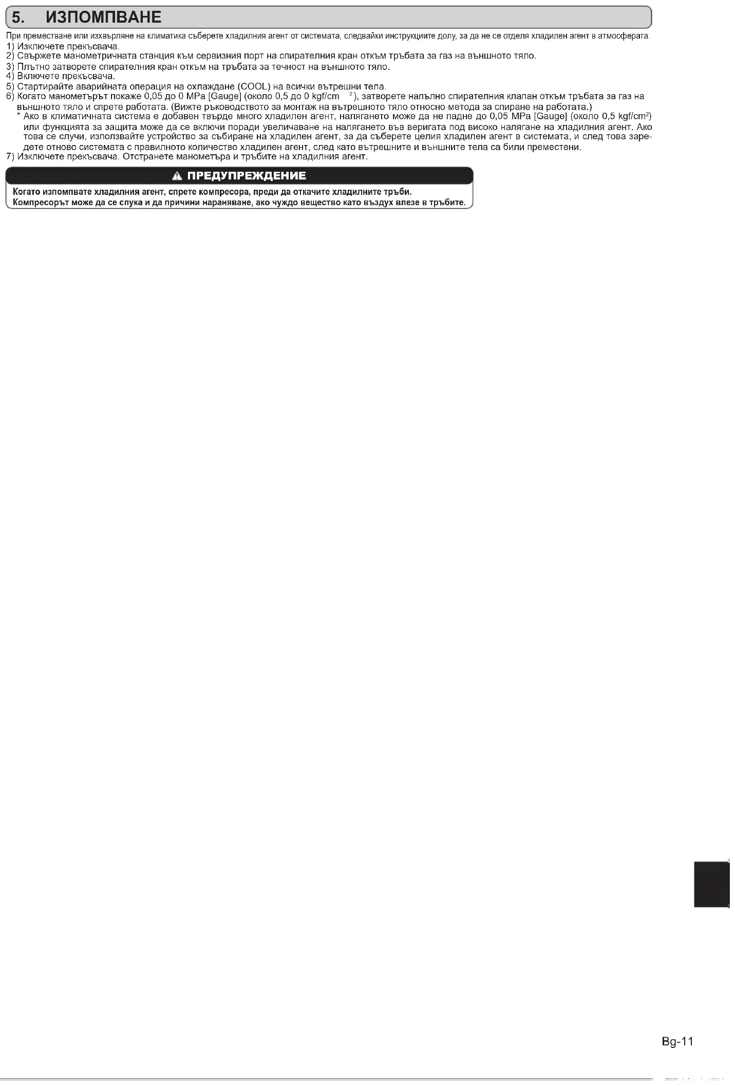 Когатоизпомпватехладилнияагент,спретекомпресора,предидаоткачитехладилнитетръби. Компресорътможедасеспукаидапричининараняване,акочуждовеществокатовъздухвлезевтръбите. ПРЕДУПРЕЖДЕНИЕ VG79A985H01_bg.indd 11 2018/9/28 9:22:44Pl-1 ZNACZENIE SYMBOLI WYŚWIETLANYCH NA JEDNOSTCE WEWNĘTRZNEJ I/LUB JEDNOSTCE ZE- WNĘTRZNEJ OSTRZEŻENIE (Ryzyko pożaru) Urządzenie wykorzystuje łatwopalny czynnik chłodniczy. W razie wycieku i kontaktu czynnika chłodniczego z ogniem lub elementem grzejnym powstanie szkodliwy gaz i wystąpi ryzyko pożaru. Przed przystąpieniem do obsługi należy uważnie przeczytać INSTRUKCJĘ OBSŁUGI. Personel serwisowy ma obowiązek uważnie przeczytać INSTRUKCJĘ OBSŁUGI i INSTRUKCJĘ MONTAŻU przed przystąpieniem do obsługi. Dodatkowe informacje można znaleźć w INSTRUKCJI OBSŁUGI, INSTRUKCJI MONTAŻU itp.