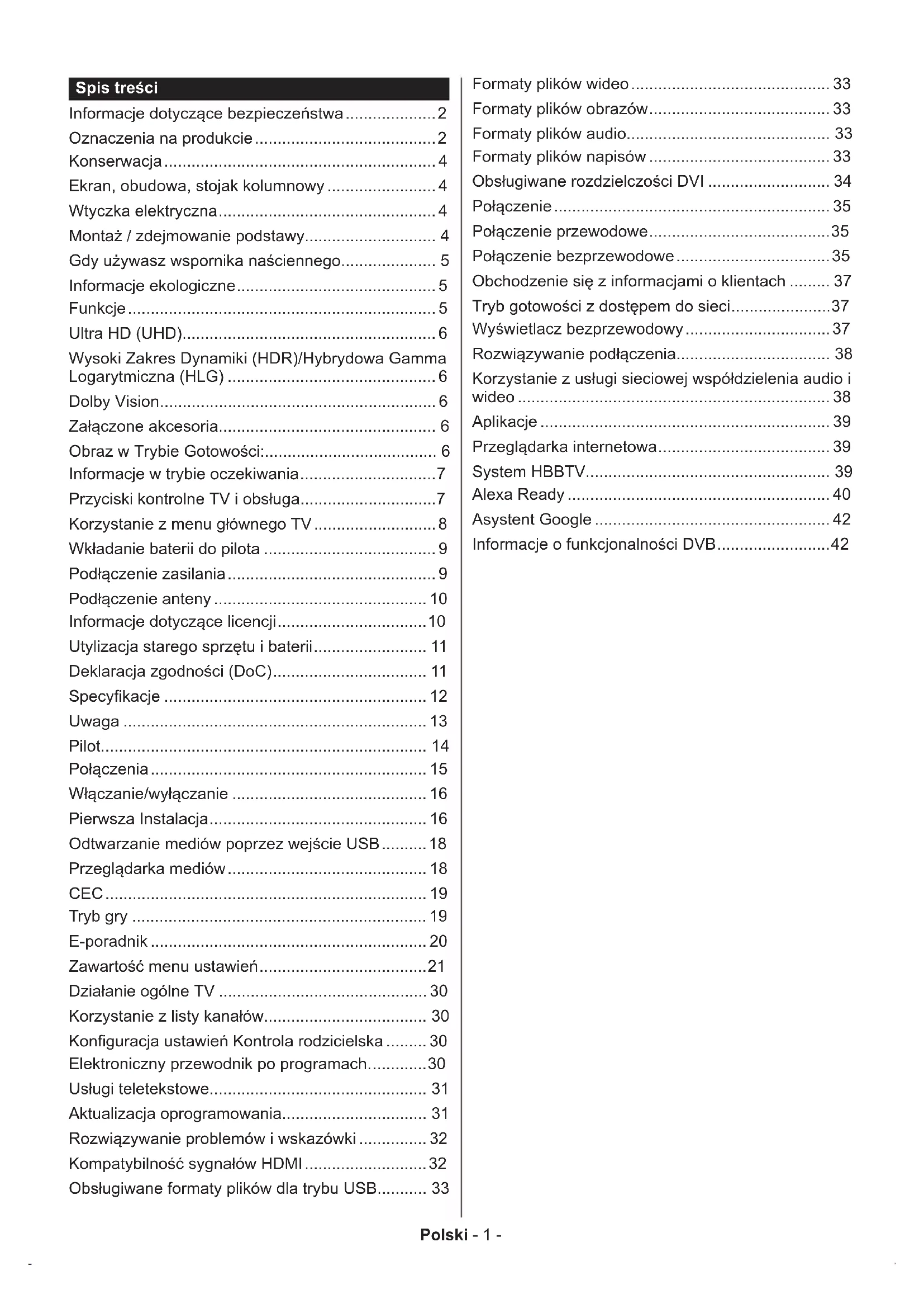 - Telewizor ten został zaprojektowany tak, aby spełniać standardy cyfrowych usług naziemnych (Marzec 2021) DVB-T/T2 (MPEG2, MPEG4-AVC(H.264) i HEVC(H.265)), cyfrowych usług kablowych DVB-C (MPEG2, MPEG4-AVC(H.264) i HEVC(H.265)) oraz cyfrowych usług satelitarnych DVB-S (MPEG2, MPEG4-AVC(H.264) i HEVC(H.265)). Zasięgnij informacji na temat dostępności usług DVB-T / T2 i DVB-S w Twojej okolicy u lokalnego dealera. Skonsultuj się dostawcą usług kablowych, aby sprawdzić dostępność serwisów DVB-C dla tego TV.