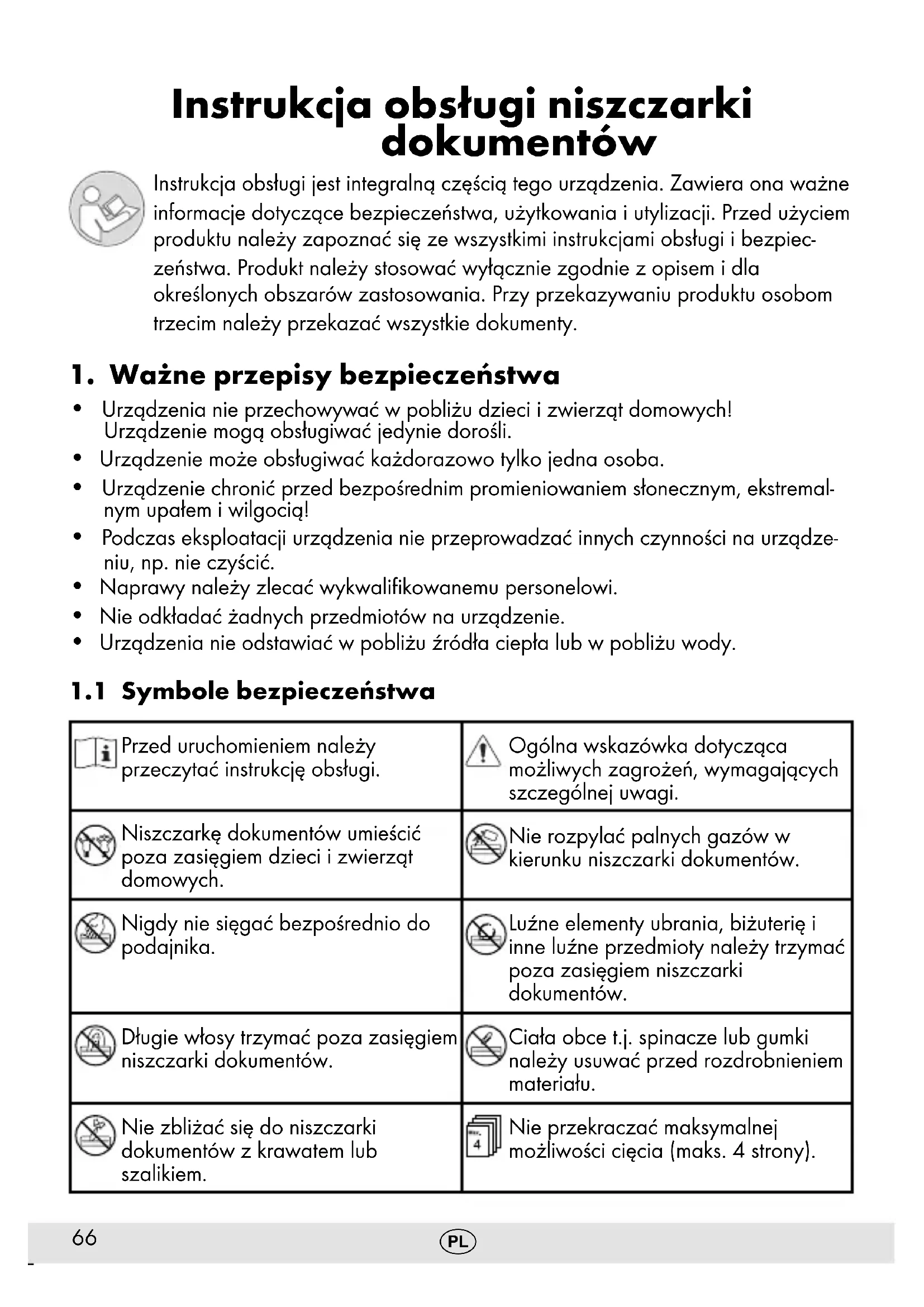Przed uruchomieniem należy przeczytać instrukcję obsługi. Ogólna wskazówka dotycząca możliwych zagrożeń, wymagających szczególnej uwagi. Niszczarkę dokumentów umieścić poza zasięgiem dzieci i zwierząt domowych. Nie rozpylać palnych gazów w kierunku niszczarki dokumentów. Nigdy nie sięgać bezpośrednio do podajnika. Luźne elementy ubrania, biżuterię i inne luźne przedmioty należy trzymać poza zasięgiem niszczarki dokumentów. Długie włosy trzymać poza zasięgiem niszczarki dokumentów. Ciała obce t.j. spinacze lub gumki należy usuwać przed rozdrobnieniem materiału. Nie zbliżać się do niszczarki dokumentów z krawatem lub szalikiem. Nie przekraczać maksymalnej możliwości cięcia (maks. 4 strony).67