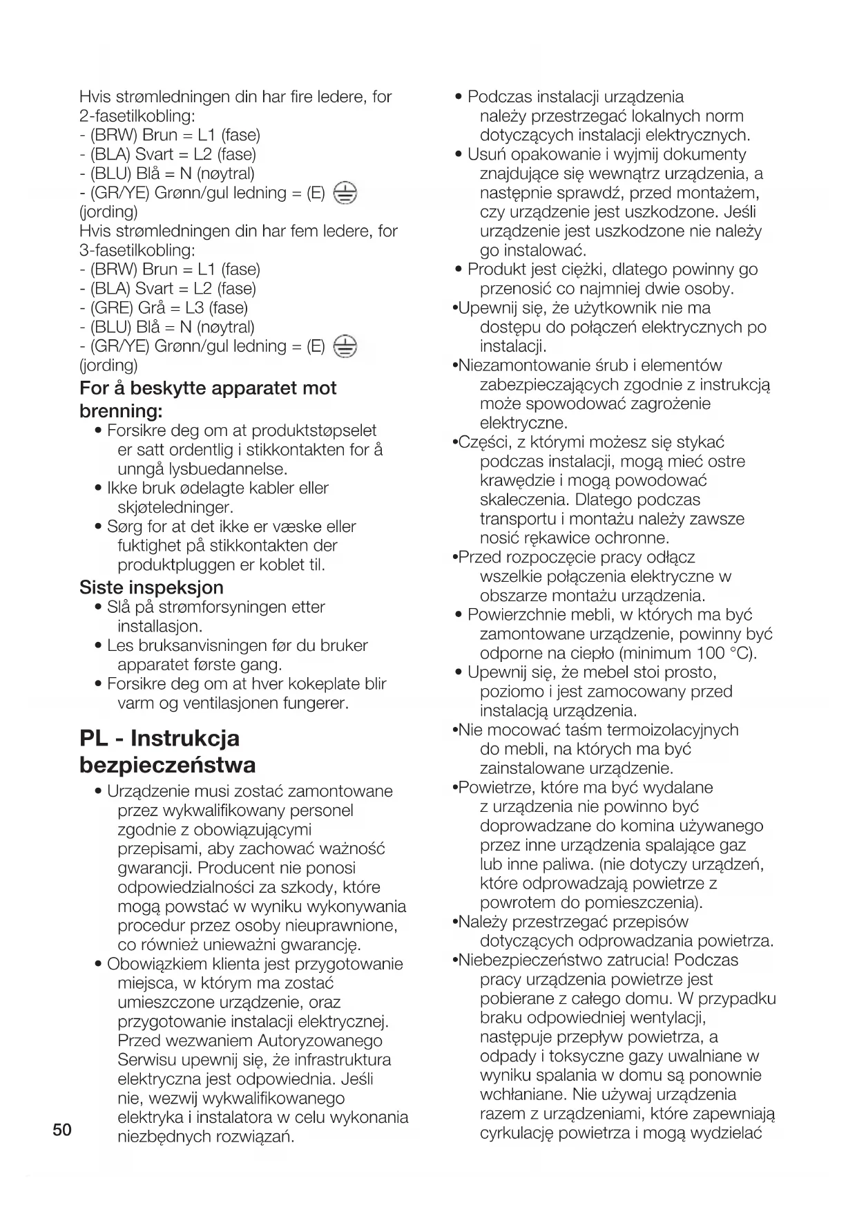 - Podłącz urządzenie do sieci elektrycznej zgodnie z poniższym opisem i typem przewodu. Typ przewodu urządzenia jest określony w rozdziale „Dane techniczne” instrukcji obsługi. Jeśli typ przewodu jest 3-żyłowy, podłącz urządzenie do sieci 1-fazowej: - (BRW) Brązowy = L (Faza) - (BLU) Niebieski = N (Neutralny) - (GR/YE) Zielony/żółty przewód = (E) (Uziemienie) Jeśli typ przewodu jest 5-żyłowy, podłącz urządzenie do sieci 1-fazowej: Dla połączenia 1-fazowego - (BRW/BLA) Brązowy/Czarny = L (Faza) - (BLU/GRE) Niebieski/Szary = N (Neutralny) - (GR/YE) Zielony/żółty przewód = (E) (Uziemienie)54 Jeśli typ przewodu jest 5-żyłowy, podłącz urządzenie do sieci 2-fazowej: - (BRW) Brązowy = L1 (Faza) - (BLA) Czarny = L2 (Faza) - (BLU/GRE) Niebieski/Szary = N (Neutralny) - (GR/YE) Zielony/żółty przewód = (E) (Uziemienie) Jeśli typ przewodu jest 4-żyłowy, podłącz urządzenie do sieci 2-fazowej: - (BRW) Brązowy = L1 (Faza) - (BLA) Czarny = L2 (Faza) - (BLU) Niebieski = N (Neutralny) - (GR/YE) Zielony/żółty przewód = (E) (Uziemienie) Jeśli typ przewodu jest 5-żyłowy, podłącz urządzenie do sieci 3-fazowej: - (BRW) Brązowy = L1 (Faza) - (BLA) Czarny = L2 (Faza) - (GRE) Szary = L3 (Faza) - (BLU) Niebieski = N (Neutralny) - (GR/YE) Zielony/żółty przewód = (E) (Uziemienie) W celu ochrony urządzenia przed oparzeniem: