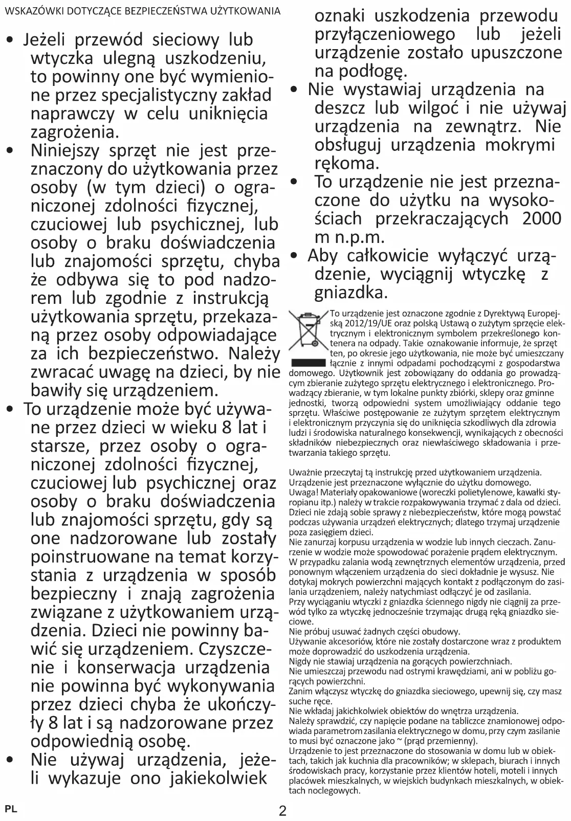 - To urządzenie może być używa- ne przez dzieci w wieku 8 lat i starsze, przez osoby o ogra- niczonej zdolności zycznej, czuciowej lub psychicznej oraz osoby o braku doświadczenia lub znajomości sprzętu, gdy są one nadzorowane lub zostały poinstruowane na temat korzy- stania z urządzenia w sposób bezpieczny i znają zagrożenia związane z użytkowaniem urzą- dzenia. Dzieci nie powinny ba- wić się urządzeniem. Czyszcze- nie i konserwacja urządzenia nie powinna być wykonywania przez dzieci chyba że ukończy- ły 8 lat i są nadzorowane przez odpowiednią osobę.