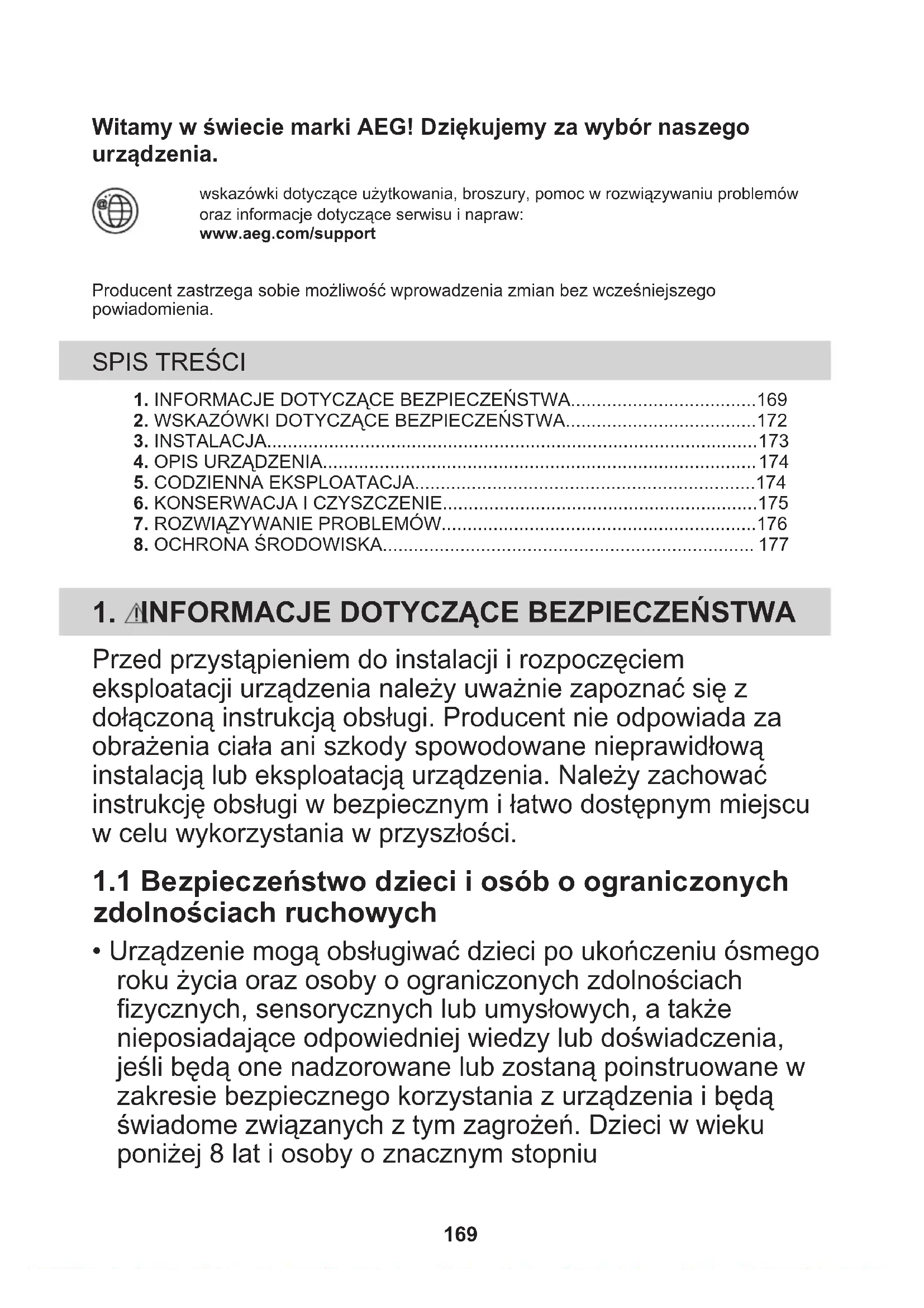 - Urządzenie mogą obsługiwać dzieci po ukończeniu ósmego roku życia oraz osoby o ograniczonych zdolnościach fizycznych, sensorycznych lub umysłowych, a także nieposiadające odpowiedniej wiedzy lub doświadczenia, jeśli będą one nadzorowane lub zostaną poinstruowane w zakresie bezpiecznego korzystania z urządzenia i będą świadome związanych z tym zagrożeń. Dzieci w wieku poniżej 8 lat i osoby o znacznym stopniu 169niepełnosprawności nie powinny zbliżać się urządzenia, jeśli nie znajdują się pod stałym nadzorem.