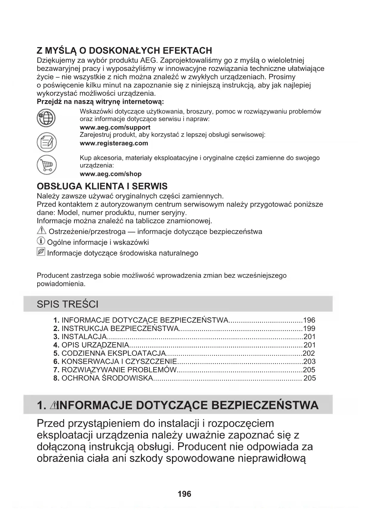 Resirkuler materialer som er merket med symbolet . Legg emballasjen i riktige beholdere for å resirkulere det. Bidrar til å beskytte miljøet, menneskers helse og for å resirkulere avfall av elektriske og elektroniske produkter. Ikke kast produkter som er merket med symbolet sammen med husholdningsavfallet. Produktet kan leveres der hvor tilsvarende produkt selges eller på miljøstasjonen i kommunen. Kontakt kommunen for nærmere opplysninger. 195Z MYŚLĄ O DOSKONAŁYCH EFEKTACH Dziękujemy za wybór produktu AEG. Zaprojektowaliśmy go z myślą o wieloletniejbezawaryjnej pracy i wyposażyliśmy w innowacyjne rozwiązania techniczne ułatwiająceżycie – nie wszystkie z nich można znaleźć w zwykłych urządzeniach. Prosimyo poświęcenie kilku minut na zapoznanie się z niniejszą instrukcją, aby jak najlepiejwykorzystać możliwości urządzenia.Przejdź na naszą witrynę internetową:Wskazówki dotyczące użytkowania, broszury, pomoc w rozwiązywaniu problemóworaz informacje dotyczące serwisu i napraw:www.aeg.com/supportZarejestruj produkt, aby korzystać z lepszej obsługi serwisowej:www.registeraeg.comKup akcesoria, materiały eksploatacyjne i oryginalne części zamienne do swojegourządzenia:www.aeg.com/shop