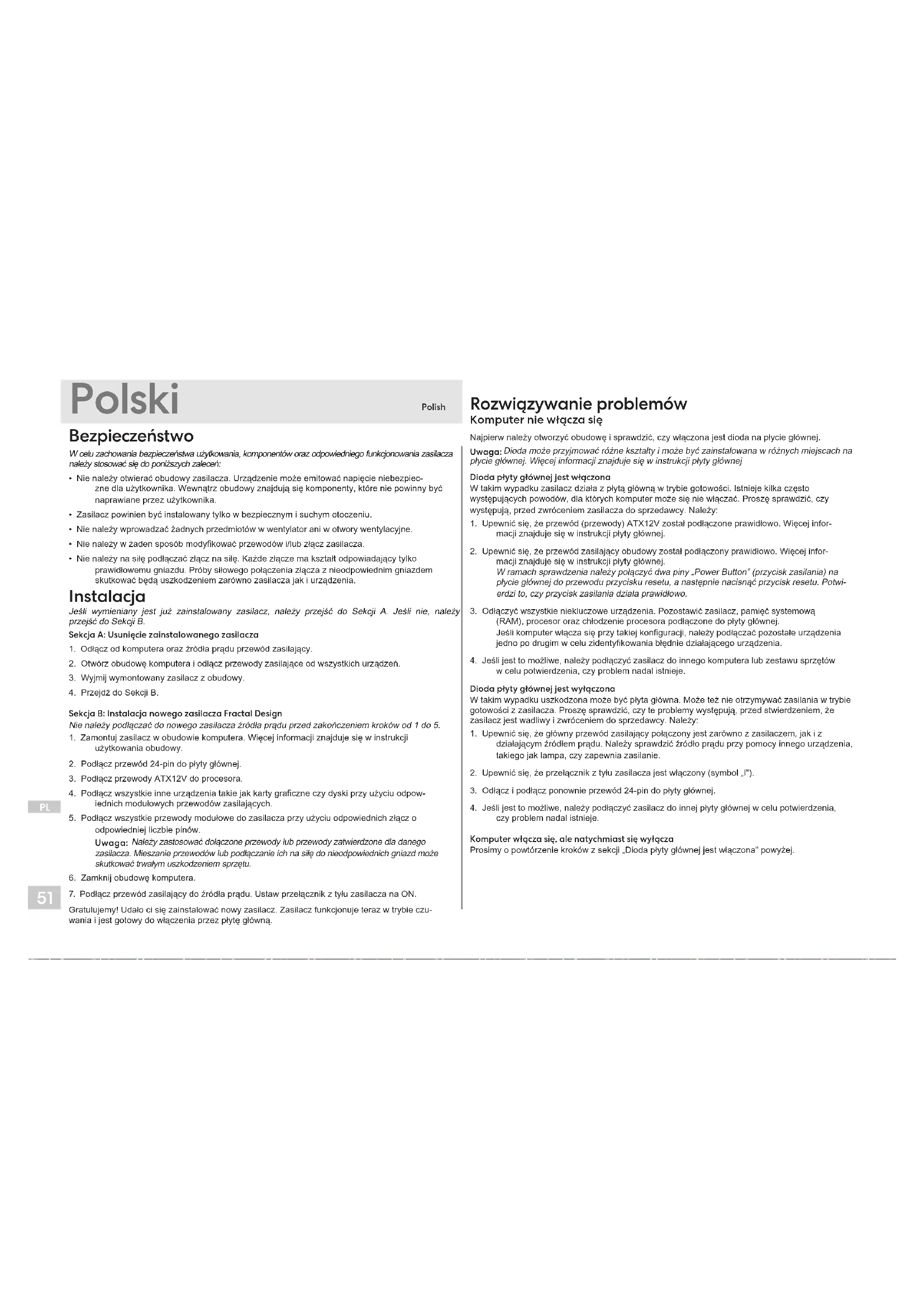 Gratulujemy! Udało ci się zainstalować nowy zasilacz. Zasilacz funkcjonuje teraz w trybie czu-wania i jest gotowy do włączenia przez płytę główną. Rozwiązywanie problemów Komputer nie włącza się Najpierw należy otworzyć obudowę i sprawdzić, czy włączona jest dioda na płycie głównej. Uwaga: Dioda może przyjmować różne kształty i może być zainstalowana w różnych miejscach na płycie głównej. Więcej informacji znajduje się w instrukcji płyty głównej Dioda płyty głównej jest włączona W takim wypadku zasilacz działa z płytą główną w trybie gotowości. Istnieje kilka często występujących powodów, dla których komputer może się nie włączać. Proszę sprawdzić, czy występują, przed zwróceniem zasilacza do sprzedawcy. Należy: 1. Upewnić się, że przewód (przewody) ATX12V został podłączone prawidłowo. Więcej infor-macji znajduje się w instrukcji płyty głównej. 2. Upewnić się, że przewód zasilający obudowy został podłączony prawidłowo. Więcej infor-macji znajduje się w instrukcji płyty głównej. W ramach sprawdzenia należy połączyć dwa piny „Power Button” (przycisk zasilania) na płycie głównej do przewodu przycisku resetu, a następnie nacisnąć przycisk resetu. Potwi- erdzi to, czy przycisk zasilania działa prawidłowo. 3. Odłączyć wszystkie niekluczowe urządzenia. Pozostawić zasilacz, pamięć systemową (RAM), procesor oraz chłodzenie procesora podłączone do płyty głównej. Jeśli komputer włącza się przy takiej konguracji, należy podłączać pozostałe urządzenia jedno po drugim w celu zidentykowania błędnie działającego urządzenia. 4. Jeśli jest to możliwe, należy podłączyć zasilacz do innego komputera lub zestawu sprzętów w celu potwierdzenia, czy problem nadal istnieje. Dioda płyty głównej jest wyłączona W takim wypadku uszkodzona może być płyta główna. Może też nie otrzymywać zasilania w trybie gotowości z zasilacza. Proszę sprawdzić, czy te problemy występują, przed stwierdzeniem, że zasilacz jest wadliwy i zwróceniem do sprzedawcy. Należy: 1. Upewnić się, że główny przewód zasilający połączony jest zarówno z zasilaczem, jak i z działającym źródłem prądu. Należy sprawdzić źródło prądu przy pomocy innego urządzenia, takiego jak lampa, czy zapewnia zasilanie. 2. Upewnić się, że przełącznik z tyłu zasilacza jest włączony (symbol „I”). 3. Odłącz i podłącz ponownie przewód 24-pin do płyty głównej. 4. Jeśli jest to możliwe, należy podłączyć zasilacz do innej płyty głównej w celu potwierdzenia, czy problem nadal istnieje. Komputer włącza się, ale natychmiast się wyłącza Prosimy o powtórzenie kroków z sekcji „Dioda płyty głównej jest włączona” powyżej.52