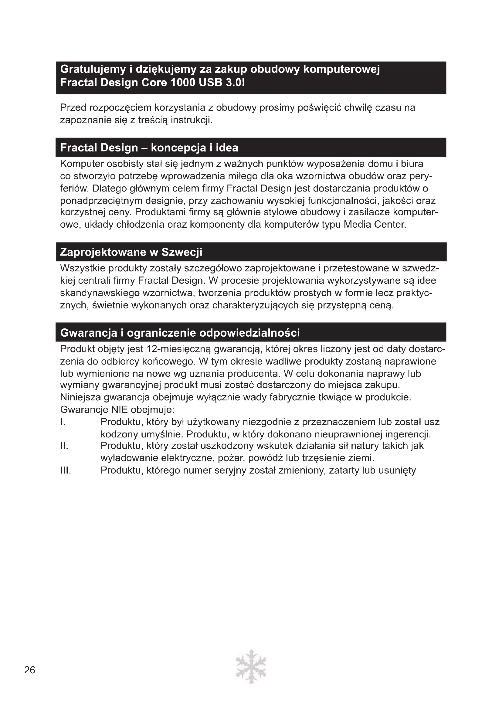 IT26 Gratulujemy i dziękujemy za zakup obudowy komputerowej Fractal Design Core 1000 USB 3.0! Przed rozpoczęciem korzystania z obudowy prosimy poświęcić chwilę czasu na zapoznanie się z treścią instrukcji. Fractal Design – koncepcja i idea Komputer osobisty stał się jednym z ważnych punktów wyposażenia domu i biura co stworzyło potrzebę wprowadzenia miłego dla oka wzornictwa obudów oraz pery- feriów. Dlatego głównym celem fi rmy Fractal Design jest dostarczania produktów o ponadprzeciętnym designie, przy zachowaniu wysokiej funkcjonalności, jakości oraz korzystnej ceny. Produktami fi rmy są głównie stylowe obudowy i zasilacze komputer- owe, układy chłodzenia oraz komponenty dla komputerów typu Media Center. Zaprojektowane w Szwecji Wszystkie produkty zostały szczegółowo zaprojektowane i przetestowane w szwedz- kiej centrali fi rmy Fractal Design. W procesie projektowania wykorzystywane są idee skandynawskiego wzornictwa, tworzenia produktów prostych w formie lecz praktyc- znych, świetnie wykonanych oraz charakteryzujących się przystępną ceną. Gwarancja i ograniczenie odpowiedzialności Produkt objęty jest 12-miesięczną gwarancją, której okres liczony jest od daty dostarc- zenia do odbiorcy końcowego. W tym okresie wadliwe produkty zostaną naprawione lub wymienione na nowe wg uznania producenta. W celu dokonania naprawy lub wymiany gwarancyjnej produkt musi zostać dostarczony do miejsca zakupu. Niniejsza gwarancja obejmuje wyłącznie wady fabrycznie tkwiące w produkcie. Gwarancje NIE obejmuje: