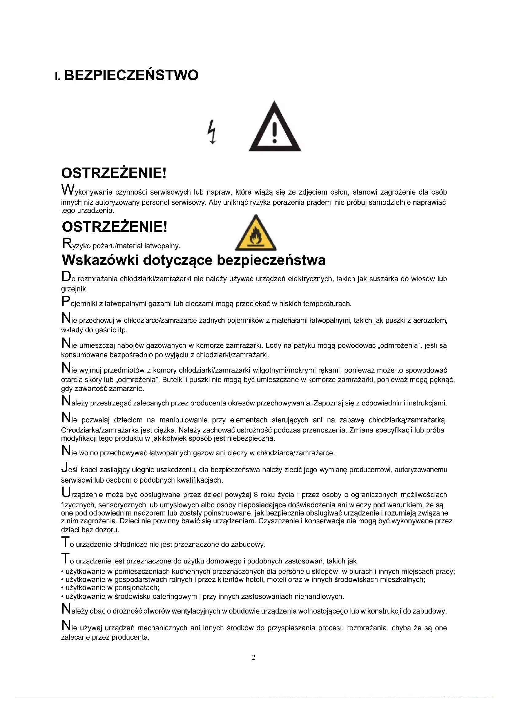 OSTRZEŻENIE! Wykonywanie czynności serwisowych lub napraw, które wiążą się ze zdjęciem osłon, stanowi zagrożenie dla osób innych niż autoryzowany personel serwisowy. Aby uniknąć ryzyka porażenia prądem, nie próbuj samodzielnie naprawiać tego urządzenia. OSTRZEŻENIE! Ryzyko pożaru/materiał łatwopalny. Wskazówki dotyczące bezpieczeństwa Do rozmrażania chłodziarki/zamrażarki nie należy używać urządzeń elektrycznych, takich jak suszarka do włosów lub grzejnik. Pojemniki z łatwopalnymi gazami lub cieczami mogą przeciekać w niskich temperaturach. Nie przechowuj w chłodziarce/zamrażarce żadnych pojemników z materiałami łatwopalnymi, takich jak puszki z aerozolem, wkłady do gaśnic itp. Nie umieszczaj napojów gazowanych w komorze zamrażarki. Lody na patyku mogą powodować „odmrożenia”. jeśli są konsumowane bezpośrednio po wyjęciu z chłodziarki/zamrażarki. Nie wyjmuj przedmiotów z komory chłodziarki/zamrażarki wilgotnymi/mokrymi rękami, ponieważ może to spowodować otarcia skóry lub „odmrożenia”. Butelki i puszki nie mogą być umieszczane w komorze zamrażarki, ponieważ mogą pęknąć, gdy zawartość zamarznie. Należy przestrzegać zalecanych przez producenta okresów przechowywania. Zapoznaj się z odpowiednimi instrukcjami. Nie pozwalaj dzieciom na manipulowanie przy elementach sterujących ani na zabawę chłodziarką/zamrażarką. Chłodziarka/zamrażarka jest ciężka. Należy zachować ostrożność podczas przenoszenia. Zmiana specyfikacji lub próba modyfikacji tego produktu w jakikolwiek sposób jest niebezpieczna. Nie wolno przechowywać łatwopalnych gazów ani cieczy w chłodziarce/zamrażarce. Jeśli kabel zasilający ulegnie uszkodzeniu, dla bezpieczeństwa należy zlecić jego wymianę producentowi, autoryzowanemu serwisowi lub osobom o podobnych kwalifikacjach. Urządzenie może być obsługiwane przez dzieci powyżej 8 roku życia i przez osoby o ograniczonych możliwościach fizycznych, sensorycznych lub umysłowych albo osoby nieposiadające doświadczenia ani wiedzy pod warunkiem, że są one pod odpowiednim nadzorem lub zostały poinstruowane, jak bezpiecznie obsługiwać urządzenie i rozumieją związane z nim zagrożenia. Dzieci nie powinny bawić się urządzeniem. Czyszczenie i konserwacja nie mogą być wykonywane przez dzieci bez dozoru. To urządzenie chłodnicze nie jest przeznaczone do zabudowy. To urządzenie jest przeznaczone do użytku domowego i podobnych zastosowań, takich jak
