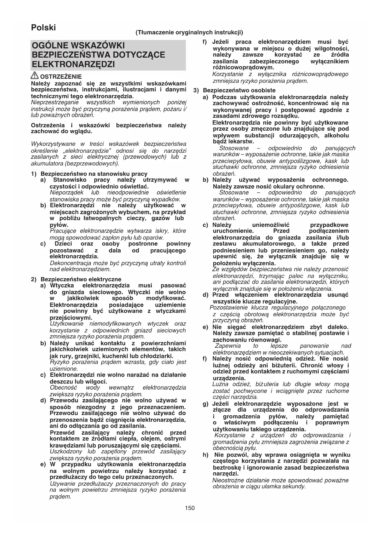 ELEKTRONARZĘDZI OSTRZEŻENIE Należy zapoznać się ze wszystkimi wskazówkami bezpieczeństwa, instrukcjami, ilustracjami i danymi technicznymi tego elektronarzędzia. Nieprzestrzeganie wszystkich wymienionych poniżej instrukcji może być przyczyną porażenia prądem, pożaru i/ lub poważnych obrażeń. Ostrzeżenia i wskazówki bezpieczeństwa należy zachować do wglądu. Wykorzystywane w treści wskazówek bezpieczeństwa określenie „elektronarzędzie” odnosi się do narzędzi zasilanych z sieci elektrycznej (przewodowych) lub z akumulatora (bezprzewodowych).