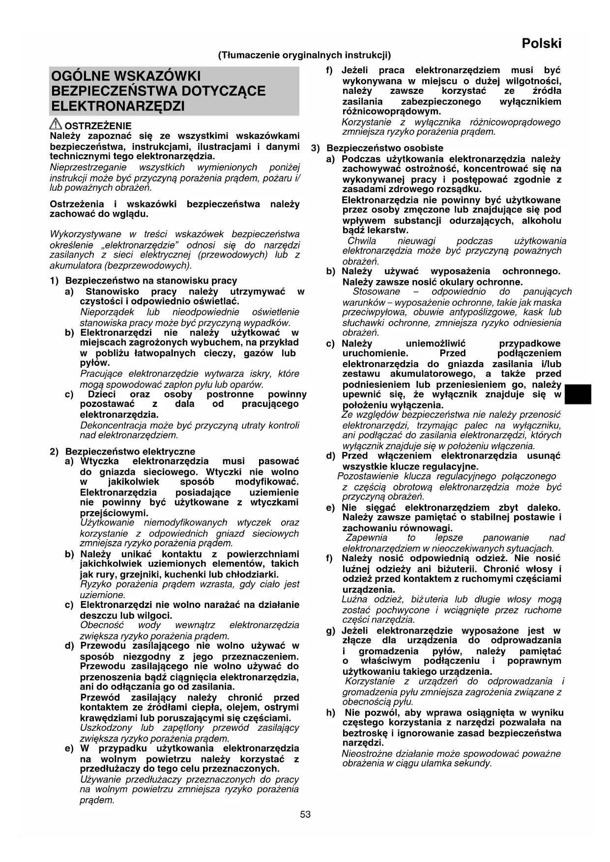 ELEKTRONARZĘDZI OSTRZEŻENIE Należy zapoznać się ze wszystkimi wskazówkami bezpieczeństwa, instrukcjami, ilustracjami i danymi technicznymi tego elektronarzędzia. Nieprzestrzeganie wszystkich wymienionych poniżej instrukcji może być przyczyną porażenia prądem, pożaru i/ lub poważnych obrażeń. Ostrzeżenia i wskazówki bezpieczeństwa należy zachować do wglądu. Wykorzystywane w treści wskazówek bezpieczeństwa określenie „elektronarzędzie” odnosi się do narzędzi zasilanych z sieci elektrycznej (przewodowych) lub z akumulatora (bezprzewodowych).