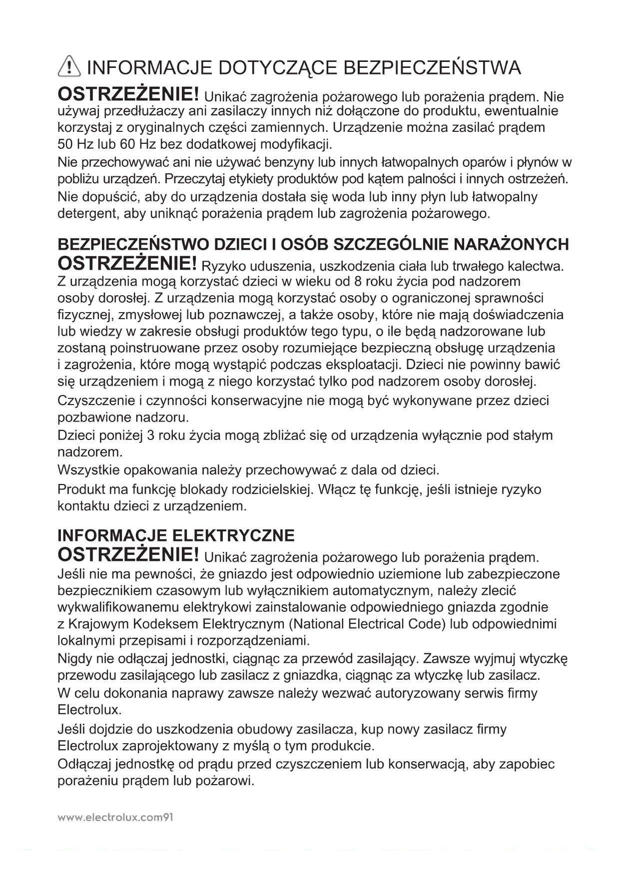 OSTRZEŻENIE! Unikać zagrożenia pożarowego lub porażenia prądem. Nie używaj przedłużaczy ani zasilaczy innych niż dołączone do produktu, ewentualnie korzystaj z oryginalnych części zamiennych. Urządzenie można zasilać prądem 50 Hz lub 60 Hz bez dodatkowej modykacji. Nie przechowywać ani nie używać benzyny lub innych łatwopalnych oparów i płynów w pobliżu urządzeń. Przeczytaj etykiety produktów pod kątem palności i innych ostrzeżeń. Nie dopuścić, aby do urządzenia dostała się woda lub inny płyn lub łatwopalny detergent, aby uniknąć porażenia prądem lub zagrożenia pożarowego. BEZPIECZEŃSTWO DZIECI I OSÓB SZCZEGÓLNIE NARAŻONYCH OSTRZEŻENIE! Ryzyko uduszenia, uszkodzenia ciała lub trwałego kalectwa. Z urządzenia mogą korzystać dzieci w wieku od 8 roku życia pod nadzorem osoby dorosłej. Z urządzenia mogą korzystać osoby o ograniczonej sprawności zycznej, zmysłowej lub poznawczej, a także osoby, które nie mają doświadczenia lub wiedzy w zakresie obsługi produktów tego typu, o ile będą nadzorowane lub zostaną poinstruowane przez osoby rozumiejące bezpieczną obsługę urządzenia i zagrożenia, które mogą wystąpić podczas eksploatacji. Dzieci nie powinny bawić się urządzeniem i mogą z niego korzystać tylko pod nadzorem osoby dorosłej. Czyszczenie i czynności konserwacyjne nie mogą być wykonywane przez dzieci pozbawione nadzoru. Dzieci poniżej 3 roku życia mogą zbliżać się od urządzenia wyłącznie pod stałym nadzorem. Wszystkie opakowania należy przechowywać z dala od dzieci. Produkt ma funkcję blokady rodzicielskiej. Włącz tę funkcję, jeśli istnieje ryzyko kontaktu dzieci z urządzeniem. INFORMACJE ELEKTRYCZNE OSTRZEŻENIE! Unikać zagrożenia pożarowego lub porażenia prądem. Jeśli nie ma pewności, że gniazdo jest odpowiednio uziemione lub zabezpieczone bezpiecznikiem czasowym lub wyłącznikiem automatycznym, należy zlecić wykwalikowanemu elektrykowi zainstalowanie odpowiedniego gniazda zgodnie z Krajowym Kodeksem Elektrycznym (National Electrical Code) lub odpowiednimi lokalnymi przepisami i rozporządzeniami. Nigdy nie odłączaj jednostki, ciągnąc za przewód zasilający. Zawsze wyjmuj wtyczkę przewodu zasilającego lub zasilacz z gniazdka, ciągnąc za wtyczkę lub zasilacz. W celu dokonania naprawy zawsze należy wezwać autoryzowany serwis rmy Electrolux. Jeśli dojdzie do uszkodzenia obudowy zasilacza, kup nowy zasilacz rmy Electrolux zaprojektowany z myślą o tym produkcie. Odłączaj jednostkę od prądu przed czyszczeniem lub konserwacją, aby zapobiec porażeniu prądem lub pożarowi.www.electrolux.com92