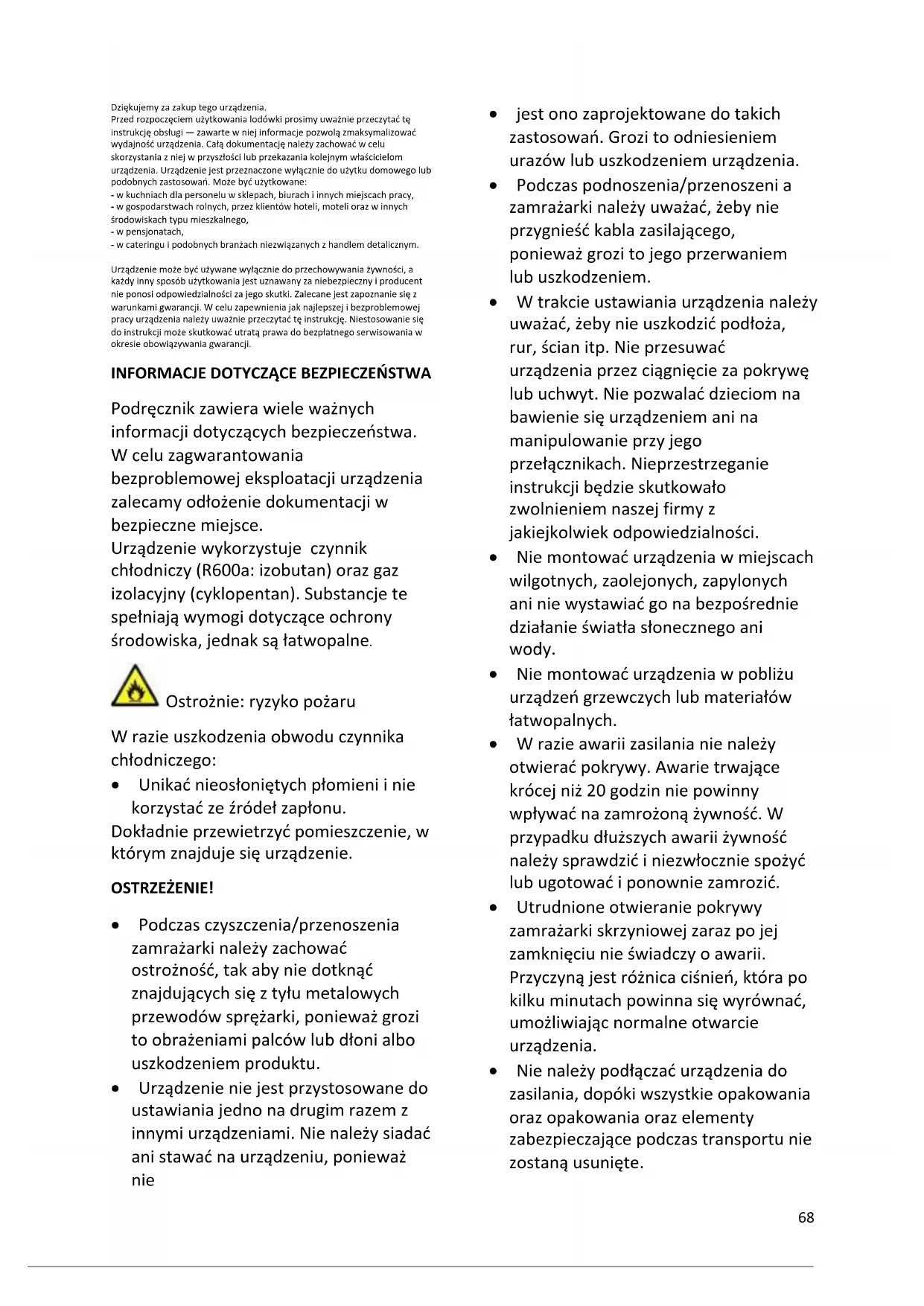 Podręcznik zawiera wiele ważnych informacji dotyczących bezpieczeństwa. W celu zagwarantowania bezproblemowej eksploatacji urządzenia zalecamy odłożenie dokumentacji w bezpieczne miejsce. Urządzenie wykorzystuje czynnik chłodniczy (R600a: izobutan) oraz gaz izolacyjny (cyklopentan). Substancje te spełniają wymogi dotyczące ochrony środowiska, jednak są łatwopalne. Ostrożnie: ryzyko pożaru W razie uszkodzenia obwodu czynnika chłodniczego: